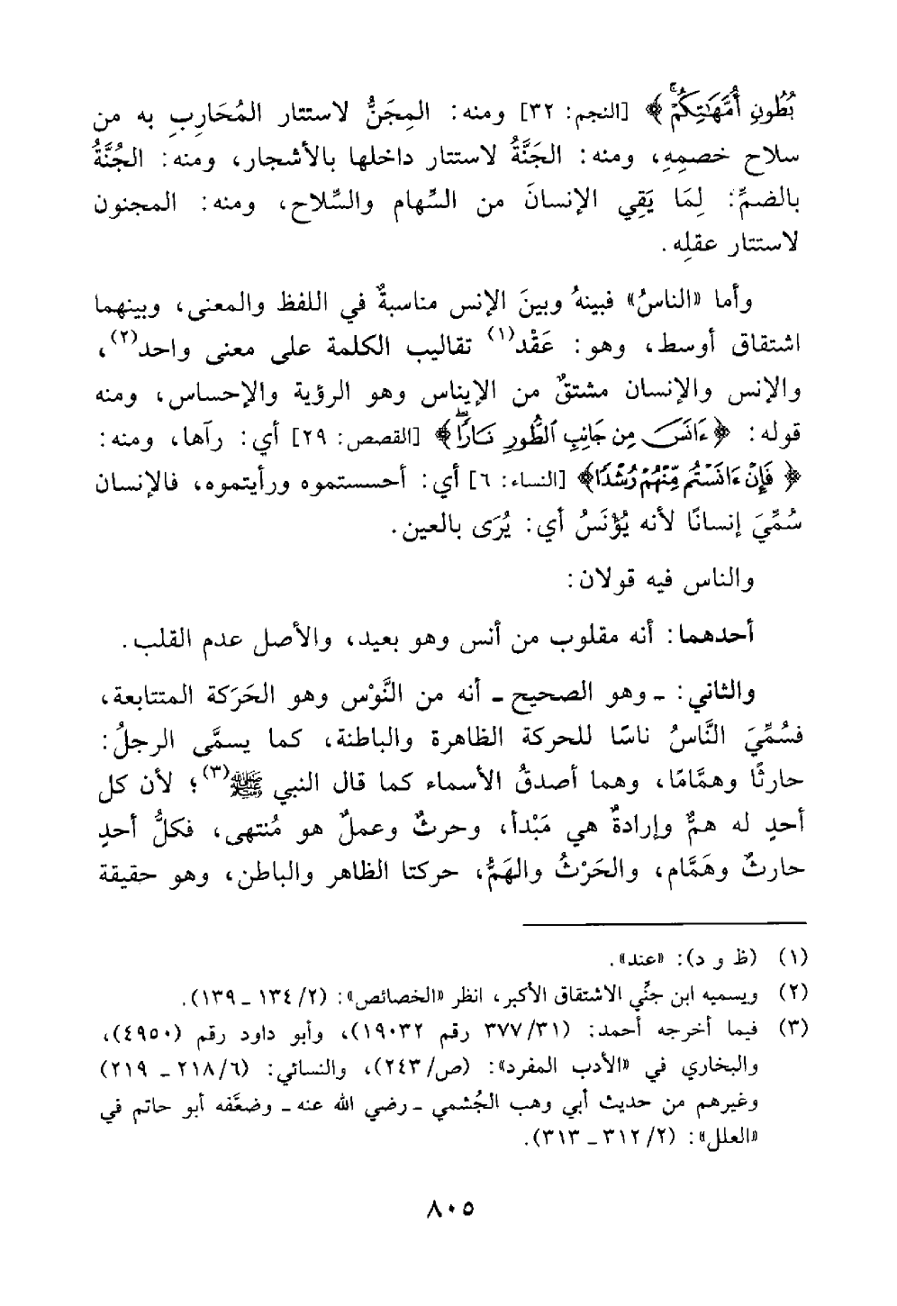 ومنه فإن آنستم منهم رشدا النساء 6 أي أحسستموه ورأيتموه فالإنسان سمي إنسانا لأنه يونس أي يرى بالعين والناس فيه قولان أحدهما أنه مقلوب من أنس وهو بعيد والأصل عدم القلب والثاني هو الصحيح أنه من النوس وهو الحركة المتتابعة فسمي الناس ناسا للحركة الظاهرة والباطنة كما سمي الرجل حارث وهمام أصدق الأسماء كما قال النبي صلى الله عليه و سلم // صحيح // لأن كل أحد له هم
