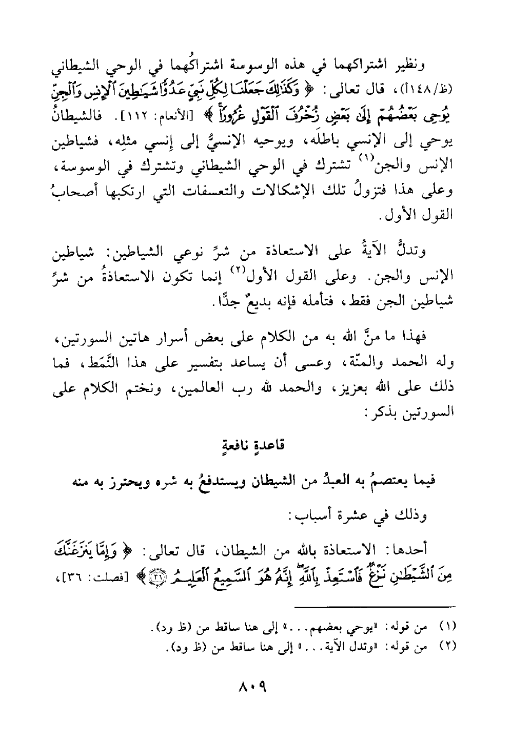 فالشيطان يوحي إلى الإنسي باطله ويوحيه الإنسي إلى إنسي مثله فشياطين الإنس والجن يشتركان في الوحي الشيطاني ويشتركان في الوسوسة وعلى هذا فتزول تلك الإشكالات والتعسفات التي ارتكبها أصحاب القول الأول وتدل الآية على الإستعاذة من شر نوعي الشياطين شياطين الإنس والجن وعلى القول الأول إنما تكون الإستعاذة من شر شياطين الجن فقط فتأمله فإنه بديع جدا