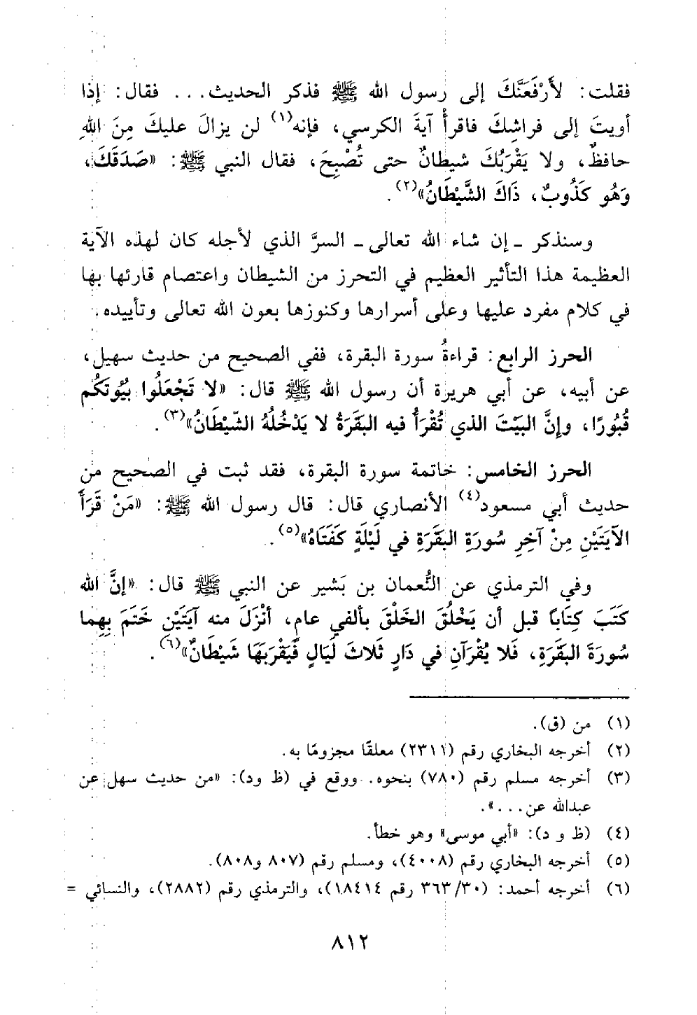الحرز الخامس قراءة خاتمة سورة البقرة فقد ثبت في الصحيح من حديث أبي موسى الأنصاري قال قال رسول الله من قرأ الآيتين من آخر سورة البقرة في ليلة كفتاه // رواه البخاري ومسلم // وفي الترمذي عن النعمان بن بشير عن النبي قال إن الله كتب كتابا قبل أن يخلق الخلق بألفي عام أنزل منه آيتين ختم بهما سورة البقرة فلا يقرآن في دار ثلاث ليال فيقربها شيطان // صحيح //@