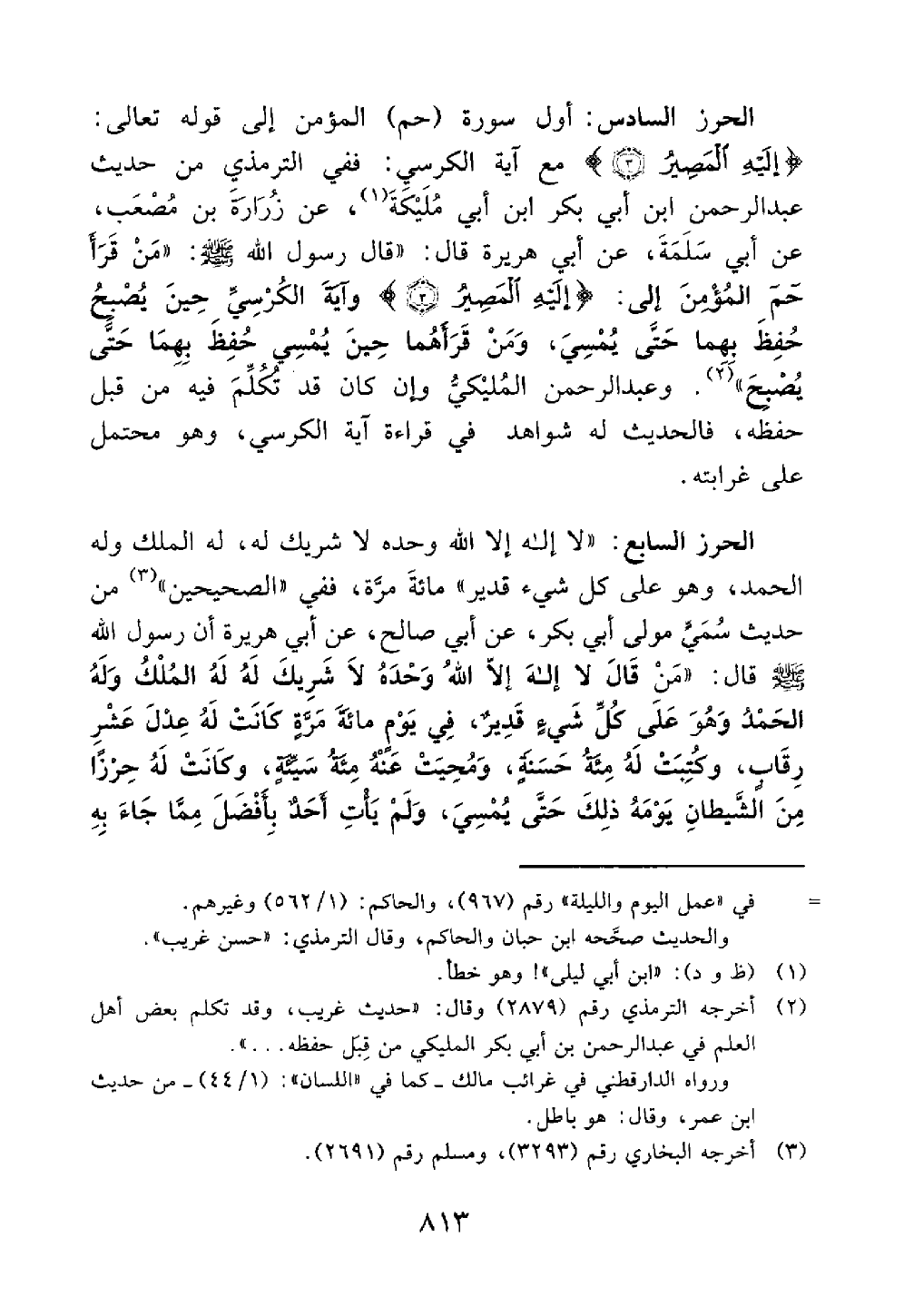الحرز السادس أول سورة حم المؤمن إلى قوله تعالى إليه المصير مع آية الكرسي في الترمذي من حديث عبدالرحمن بن أبي بكر عن ابن أبي مليكة عن زرارة بن مصعب عن أبي سلمة عن أبي هريرة قال قال رسول الله من قرأ حم المؤمن إلى إليه المصير وآية الكرسي حين يصبح حفظ بهما حتى يمسي ومن قرأهما حين يمسي حفظ بهما حتى يصبح // ضعيف // وعبدالرحمن المليكي وإن كان قد تكلم فيه من قبل حفظه فالحديث له شواهد في قراءة آية الكرسي وهو محتمل على غرابته