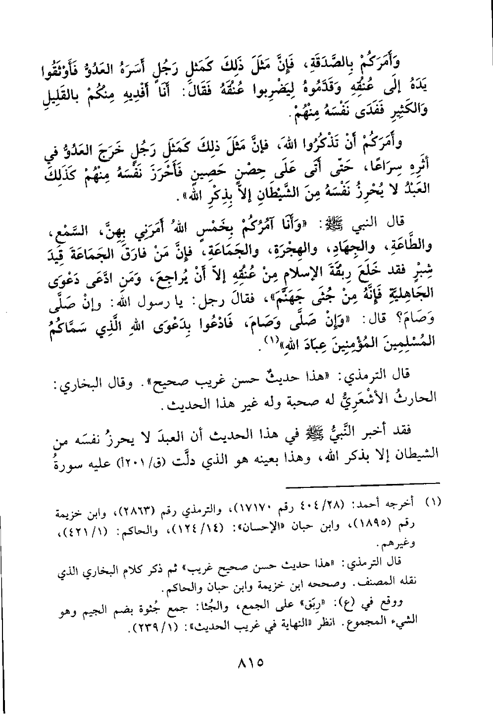 قال الترمذي هذا حديث حسن غريب صحيح وقال البخاري الحارث الأشعري له صحبة وله غير هذا الحديث فقد أخبر النبي في هذا الحديث أن العبد لا يحرز نفسه من الشيطان إلا بذكر الله وهذا بعينه هو الذي دلت عليه سورة@
