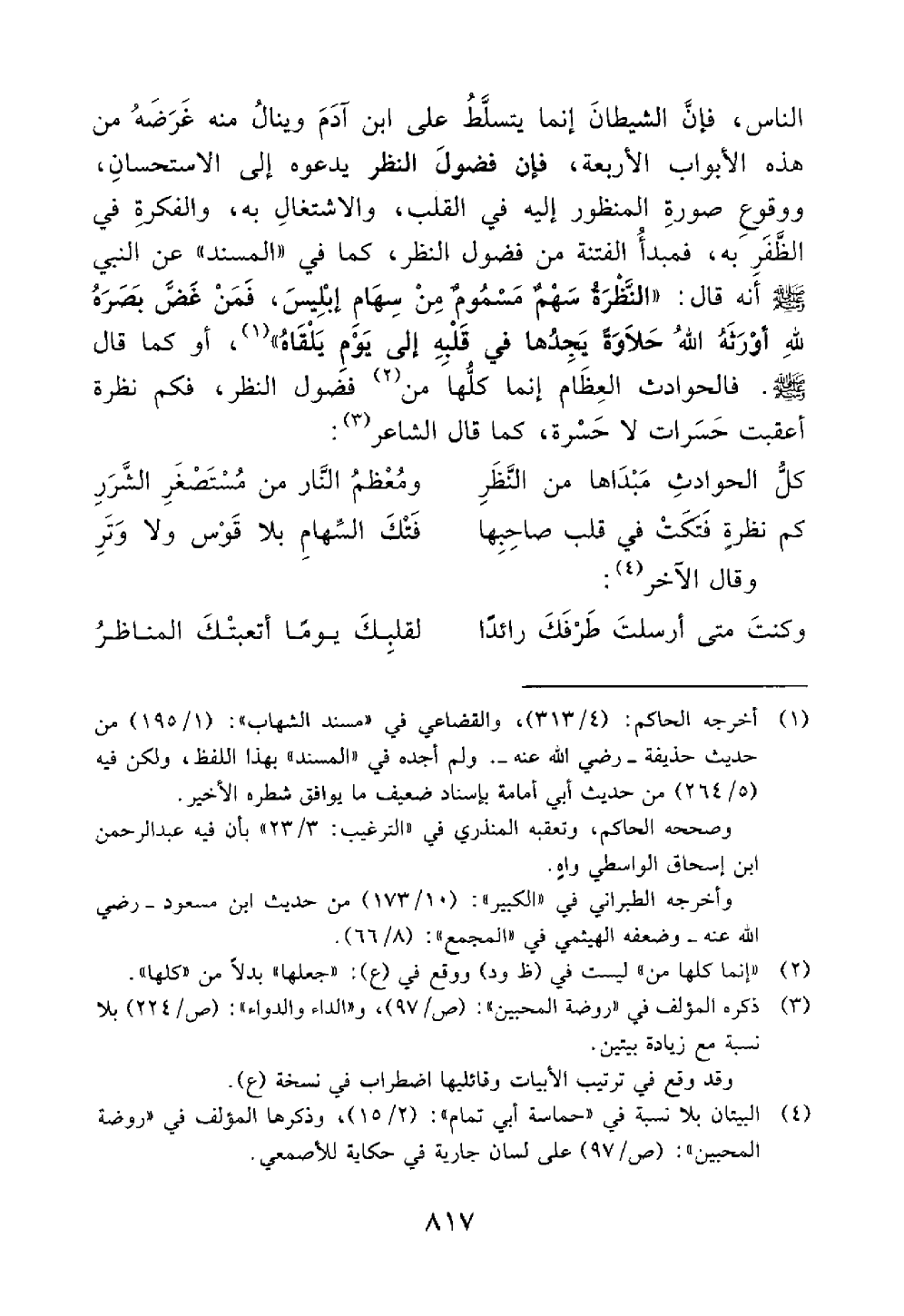 الناس فإن الشيطان إنما يتسلط على ابن آدم وينال منه غرضه من هذه الأبواب الأربعة فإن فضول النظر يدعو إلى الإستحسان ووقوع صورة المنظور إليه في القلب والإشتغال به والفكرة في الظفر به فمبدأ الفتنة من فضول النظر كما في المسند عن النبي أنه قال النظرة سهم مسموم من سهام إبليس فمن غض بصره لله أورثه الله حلاوة يجدها في قلبه إلى يوم يلقاه // ضعيف جدا // أو كما قال فالحوادث العظام إنما كلها من فضول النظر فكم نظرة أعقبت حسرات لا حسرة كما قال الشاعر