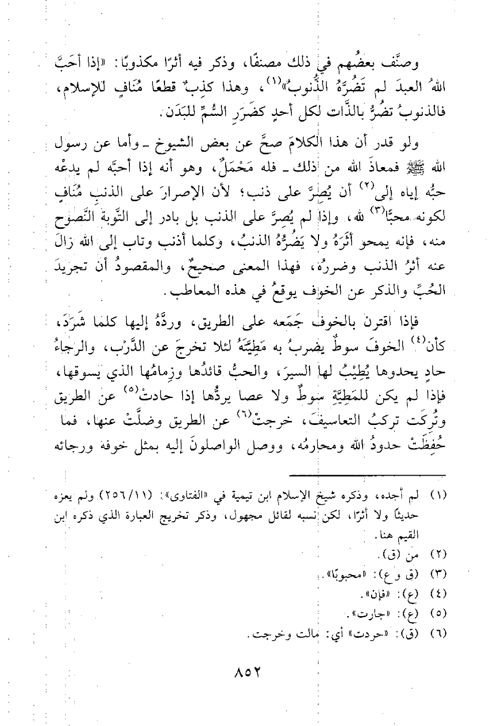من ذلك فله محمل وهو أنه إذا أحبه لم يدعه حبه إياه إلى أن يصر على ذنب لأن الإصرارعلى الذنب مناف لكونه محبا لله وإذا لم يصر على الذنب بل بادر إلى التوبة النصوح منه فإنه يمحو أثره ولا يضر الذنب وكلما أذنب وتاب إلى الله زال عنه أثر الذنب وضرره فهذا المعنى صحيح والمقصود أن تجريد الحب والذكر عن الخوف يوقع في هذه المعاطب