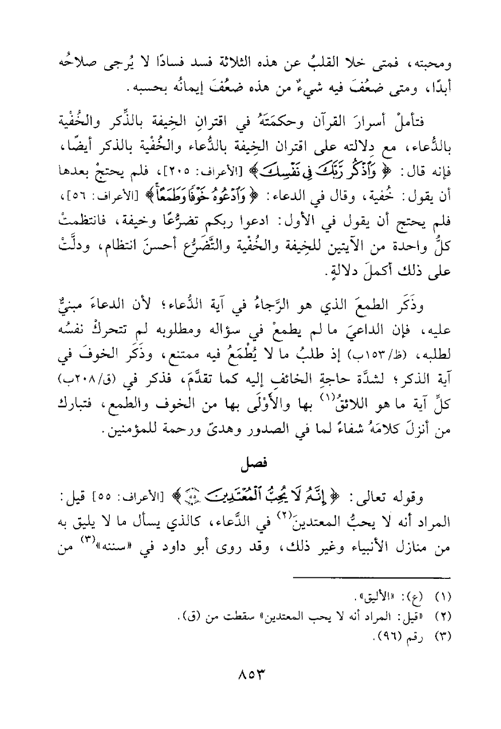 فتأمل أسرار القرآن الكريم وحكمته في هذا الاقتران فإنه قال اذكر ربك في نفسك فلم يحتج بعدها أن يقول خفية وقال في الدعاء وادعوه خوفا وطمعا فلم يحتج أن يقول في الأول ادعوا ربكم تضرعا وخيفة فانتظمت كل واحدة من الآيتين للخيفة والخفية والتضرع أحسن انتظام ودلت على ذلك أكمل دلالة وذكر الطمع الذي هو الرجاء في آية الدعاء لأن الدعاء مبني عليه فإن الداعي ما لم يطمع في سؤله ومطلوبه لم تتحرك نفسه لطلبة إذ طلب ما لا طمع فيه ممتنع وذكر الخوف في آية الذكر لشدة حاجة الخائف إليه كما تقدم فذكر في كل آية ما هو اللائق بها والأولى بها من الخوف والطمع فتبارك من أنزل كلامه شفاء لما في الصدور وهدي ورحمة للمؤمنين فصل المقصود بقوله إنه لا يحب المعتدين