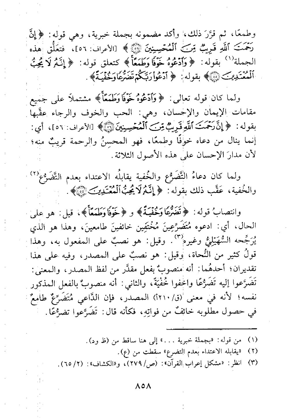 ولما كان دعاء التضرع والخفية يقابله الاعتداء بعدم التضرع والخفية عقب ذلك بقوله إنه لا يحب المعتدين وجوب انتصاب قوله خوفا وطمعا