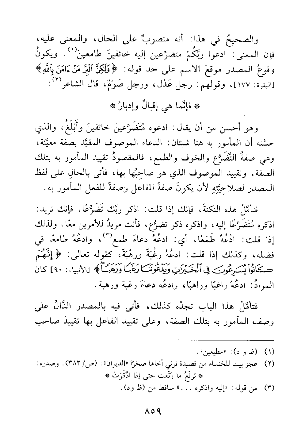 وهو أحسن من أن يقال ادعوه متضرعين خائفين والذي حسنه أن المأمور به هنا شيئان الدعاء الموصوف المقيد بصفة معينة وهي صفة التضرع والخوف والطمع فالمقصود تقييد المأمور به بتلك الصفة وتقييد الموصوف الذي هو صاحبها بها فأتى بالحال على لفظ المصدر لصلاحيته لأن يكون صفة للفاعل وصفة للفعل المأمور به فتأمل هذه النكتة فإنك إذا قلت اذكر ربك تضرعا فإنك تريد اذكره متضرعا إليه واذكره ذكر تضرع فأنت مريد للأمرين معا ولذلك إذا قلت ادعه طمعا أي ادعه دعاء طمع وادعه طامعا في فضله وكذلك إذا قلت ادعه رغبة ورهبة كقوله تعالى إنهم كانوا يسارعون في الخيرات ويدعوننا رغبا ورهبا كان المراد ادعه راغبا وراهبا وادعه دعاء رغبة ورهبة
