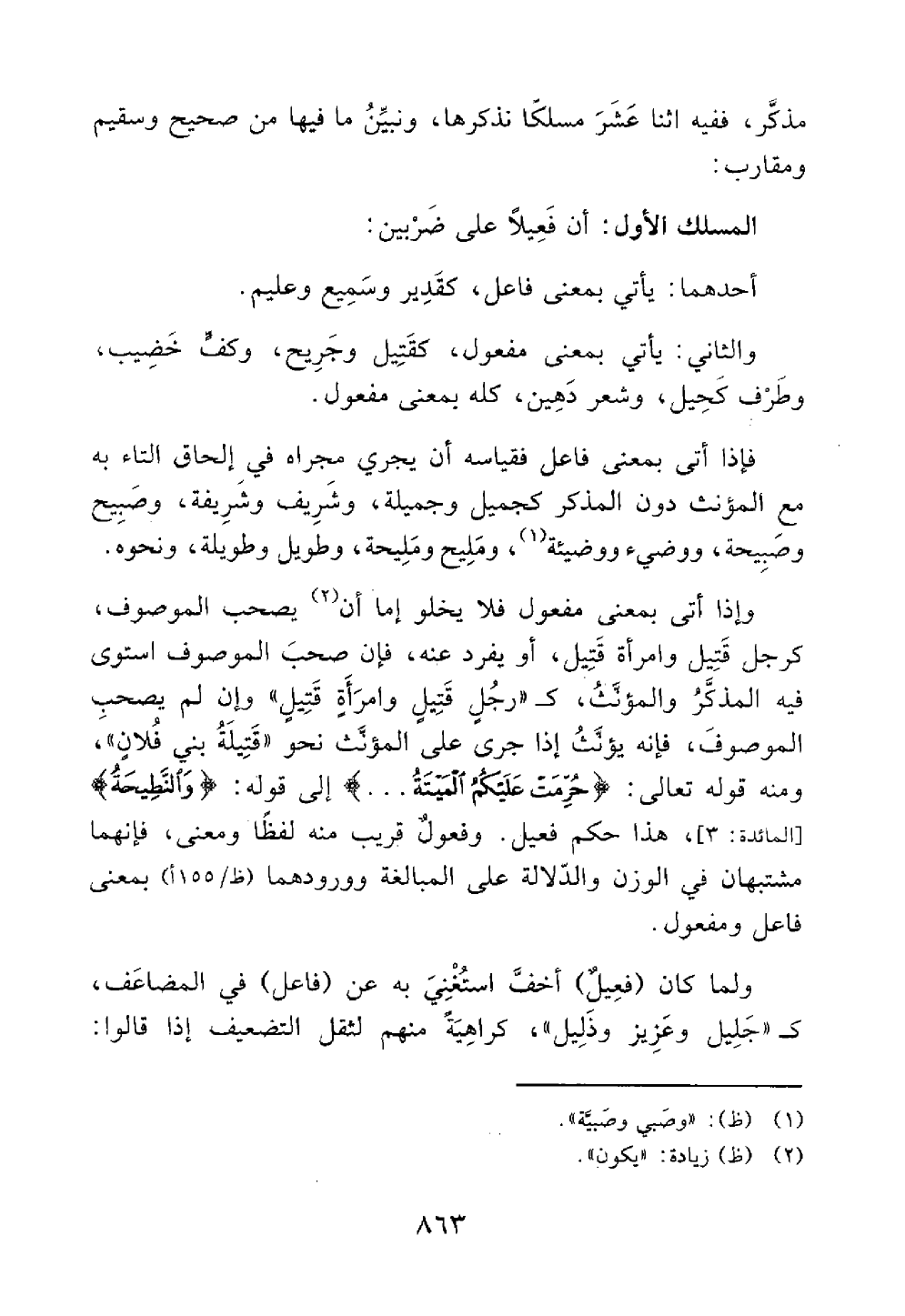 المسلك الأول أن فعيلا على ضربين احدهما يأتي بمعنى فاعل كقدير وسميع وعليم والثاني يأتي بمعنى مفعول كقتيل وجريح وكف خضيب وطرف كحيل وشعر دهين كله بمعنى مفعول