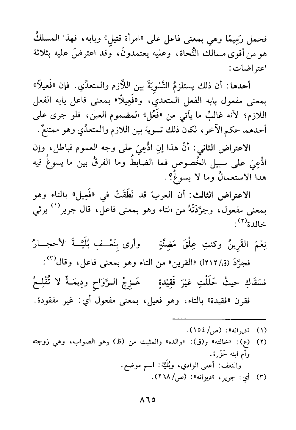 الاعتراض الثالث أن العرب قد نطقت في فعيل بالتاء وهو بمعنى مفعول وجردته من التاء وهو بمعنى فاعل قال جرير يرثي خالته