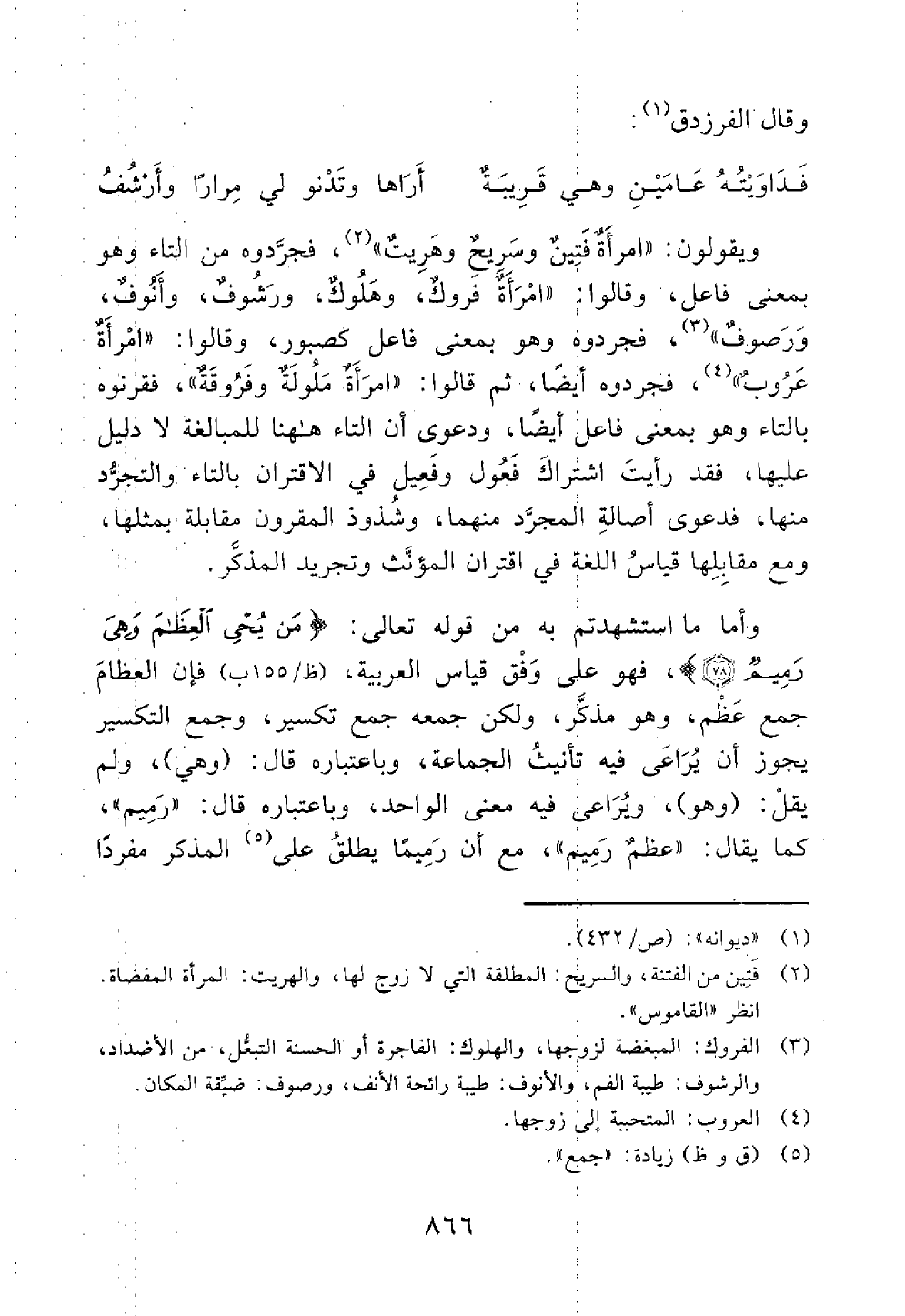 ويقولون امرأة فتين وسريح وهريت فجردوه عن التاء وهو بمعنى فاعل وقالوا امرأة فروك وهلوك ورشوف وأنوف فجردوه وهو بمعنى فاعل كصبور وقالوا امرأة عروب فجردوه وهو بمعنى فاعل أيضا ودعوى أن التاء ههنا للمبالغة لا دليل عليها فقد رأيت اشتراك فعول وفعيل في الاقتران بالتاء والتجرد منها فدعوى أصالة المجرد منهما وشذوذ المقرون مقابلة بمثلها ومع مقابلها قياس اللغة في اقتران المؤنث وتجريد المذكور