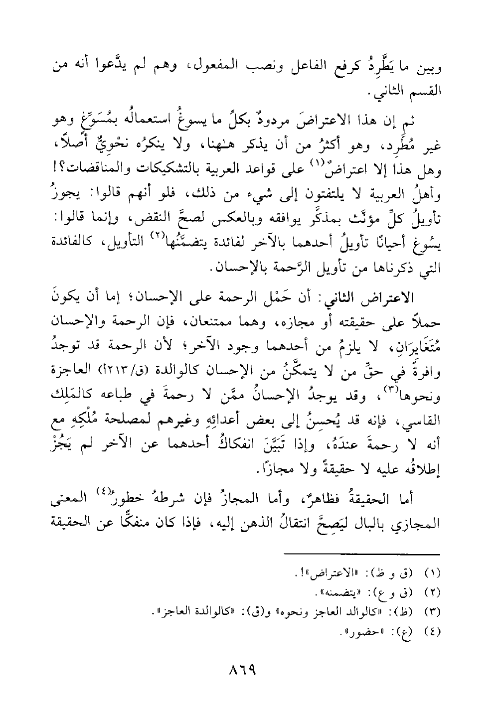 الاعتراض الثاني أن حمل الرحمة على الإحسان إما أن يكون حملا على حقيقتة أو مجازة وهما ممتنعان فإن الرحمة والإحسان متغايران لا يلزم من أحدهما وجود الآخر لأن الرحمة قد توجد وافرة في حق من لا يتمكن من الإحسان كالوالدة العاجزة ونحوها وقد يوجد الإحسان ممن لا رحمة في طباعة كالملك القاسي فإنه قد يحسن إلى بعض أعدائه وغيرهم لمصلحة ملكه مع أنه لا رحمة عنده وإذا تبين انفكاك أحدهما عن الآخر لم يجز إطلاقه عليه لا حقيقة ولا مجازا
