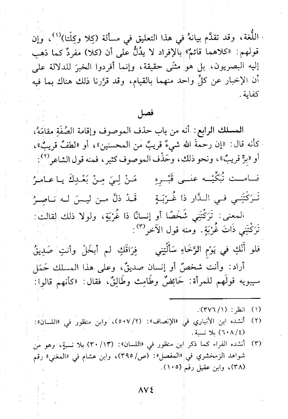 فصل المسلك الرابع أنه من باب حذف الموصوف وإقامة الصفة مقامة كأنه قال إن رحمة الله شيء قريب من المحسنين أو لطف قريب أو بر قريب ونحو ذلك وحذف الموصوف كثير فمنه قول الشاعر