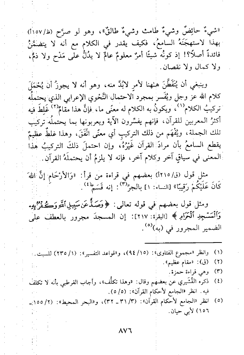 وإن احتمل ذلك التركيب هذا المعنى في سياق آخر وكلام آخر فإنه لا يلزم أن يحتمله القرآن مثل قول بعضهم في قراءة من قرأ والأرحام إن الله كان عليكم رقيبا بالجر أنه قسم ومثل قول بعضهم في قوله تعالى وصد عن سبيل الله وكفر به والمسجد الحرام إن المسجد مجرور بالعطف على الضمير المجرور في به@
