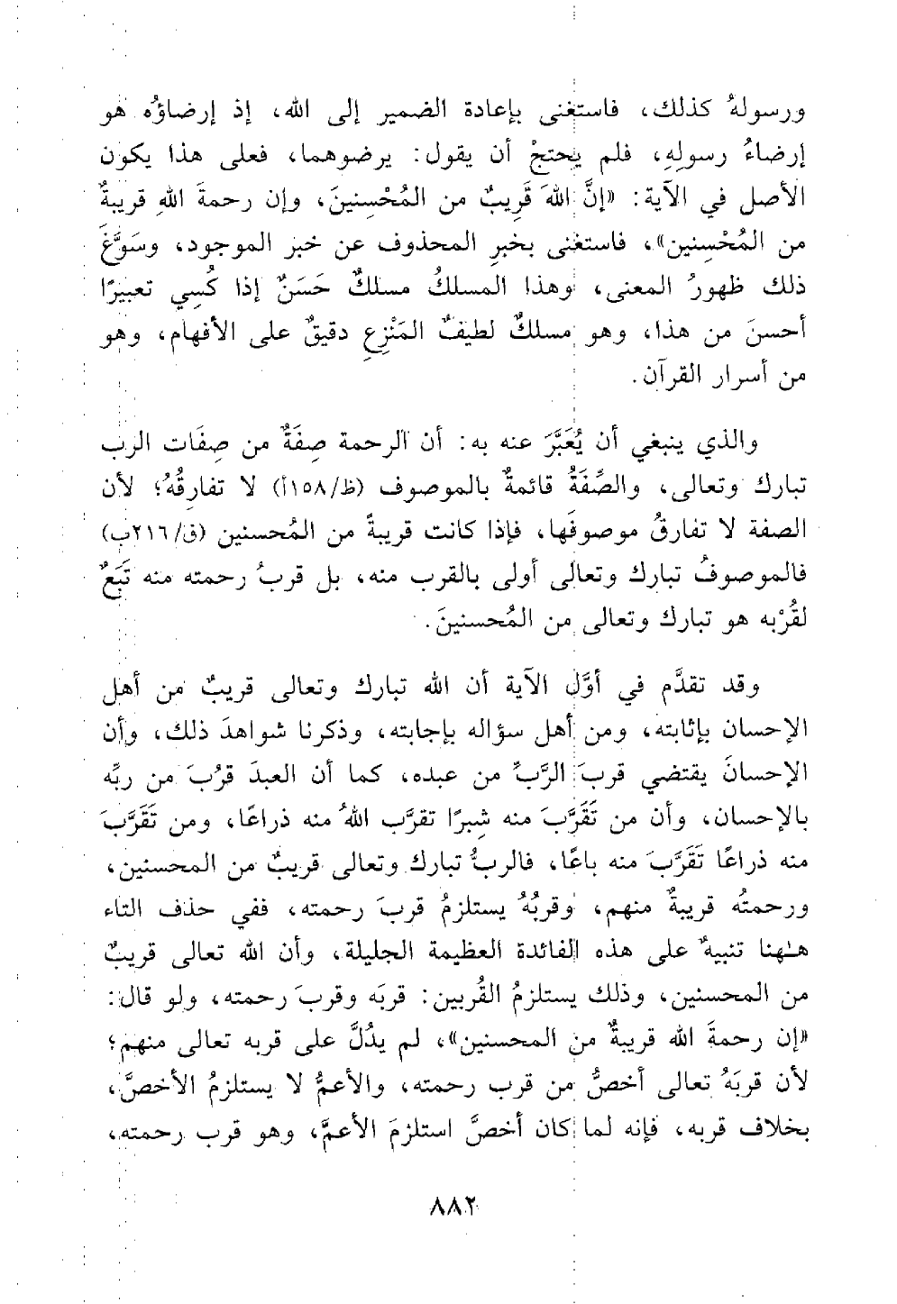 المعنى والله أحق أن يرضوه ورسوله كذلك فاستغنى بإعادة الضمير إلى الله إذ إرضاؤه هو ارضاء رسوله فلم يحتج أن يقول يرضوهما فعلى هذا يكون الأصل في الآية إن الله قريب من المحسنين وإن رحمة الله قريبة من المحسنين فاستغنى بخبر المحذوف عن خبر الموجود وسوغ ذلك ظهور المعنى وهذا المسلك مسلك حسن إذا كسي تعبيرا أحسن من هذا وهومسلك لطيف المنزع دقيق على الأفهام وهو من أسرار القرآن والذي ينبغي أن يعبر عنه به أن الرحمة صفة من صفات الرب تبارك وتعالى والصفة قائمة بالموصوف لا تفارقه لأن الصفة لا تفارق موصوفها فإذا كانت قريبة من المحسنين فالموصوف تبارك وتعالى أولى بالقرب منه بل قرب رحمته تبع لقربه هو تبارك وتعالى من المحسنين