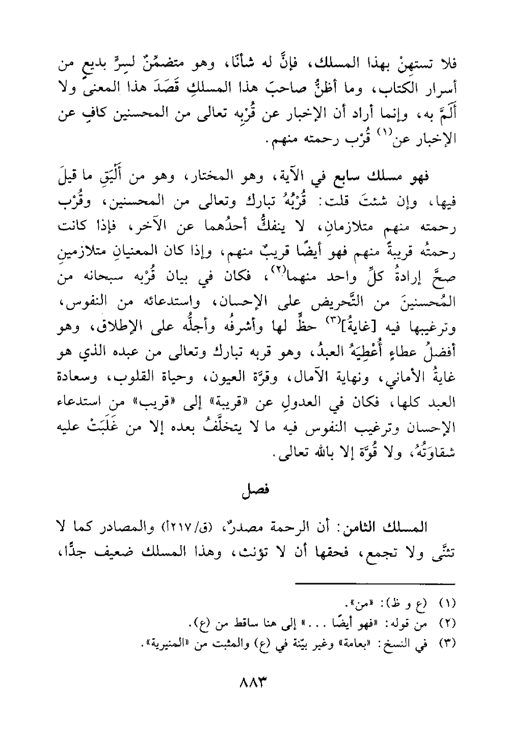 فهو مسلك سابع في الآية وهو المختار وهو من أليق ما قيل فيها وإن شئت قلت قربة تبارك وتعالى من المحسنين وقرب رحمته منهم متلازمان لا ينفك أحدهما عن الآخر فإذا كانت رحمته قريبة منهم فهو أيضا قريب منهم وإذا كان المعنيان متلازمين صح إرادة كل واحد منهما فكان في بيان قربه سبحانه من المحسنين من التحريض على الإحسان واستدعائه من النفوس وترغيبها فيه غاية حظ وأشرفه وأجله على الإطلاق وهو أفضل إعطاء أعطيه العبد وهو قربة تبارك وتعالى من عبده الذي هو غاية الأماني ونهاية الآمال وقرة العيون وحياة القلوب وسعادة العبد كلها فكان في