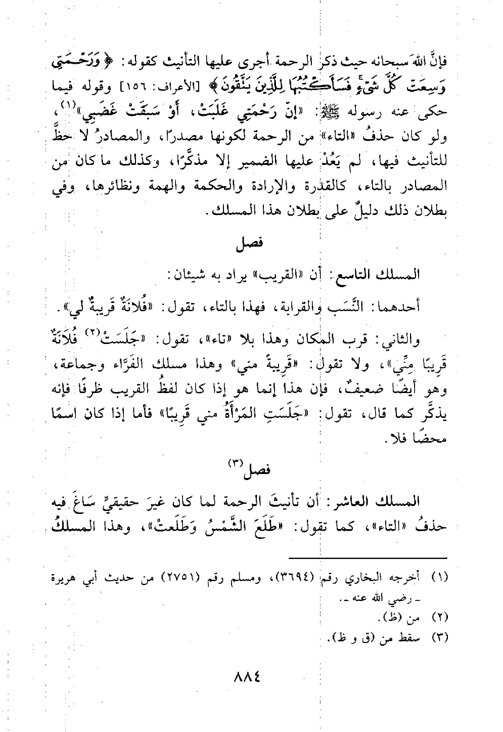 فإن الله سبحانه حيث ذكر الرحمة أجرى عليها التأنيث كقوله ورحمتي وسعت كل شيء فسأكتبها للذين يتقون وقوله فيما حكى عنه رسوله إن رحمتي غلبت أو سبقت غضبي // رواه البخاري ومسلم والترمذي // ولو كان حذف التاء من الرحمة لكونها مصدرأ والمصادر لا حظ للتأنيث فيها لم يعد عليها الضمير إلا مذكرا وكذلك ما كان من المصادر بالتاء كالقدرة