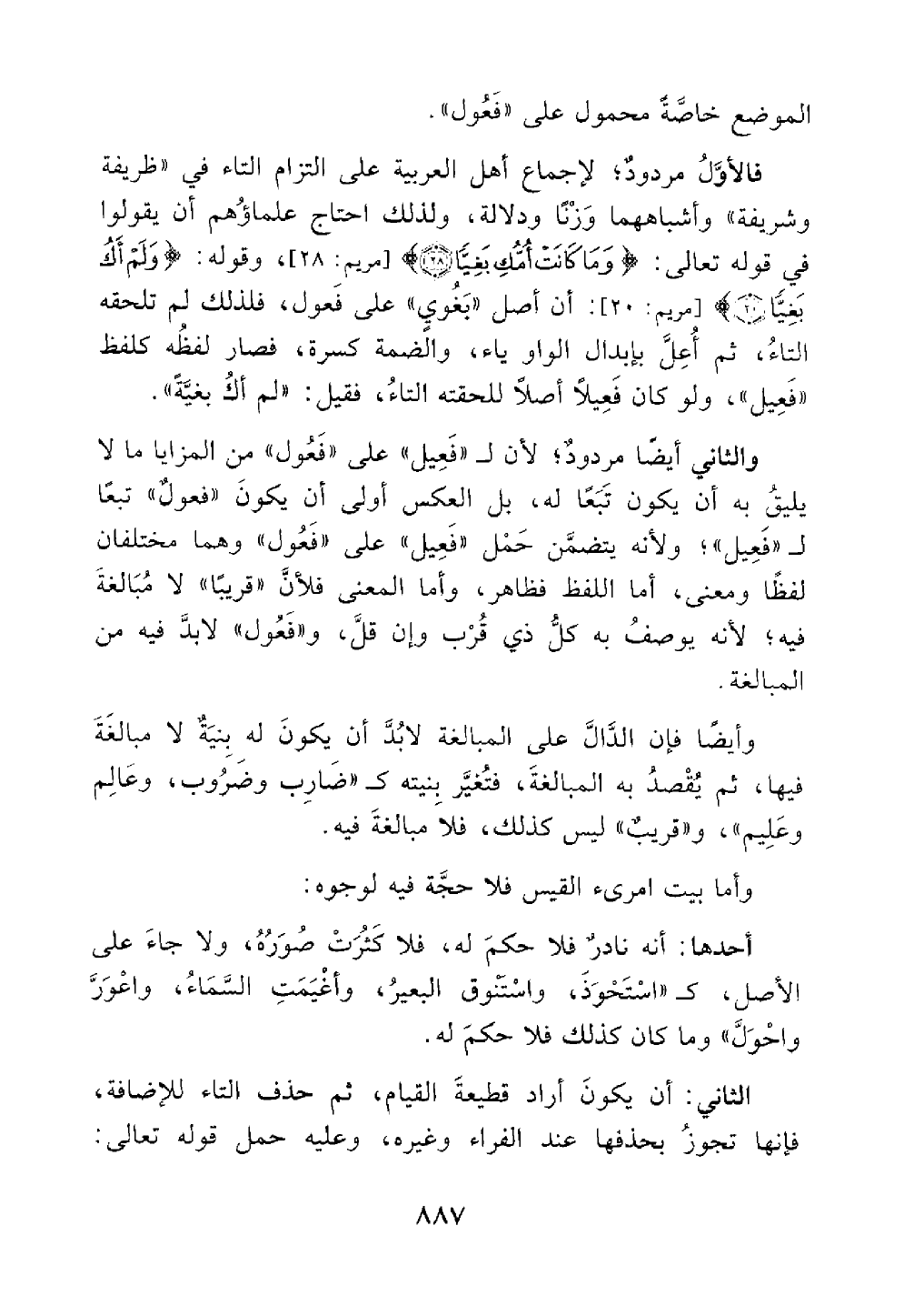 وأيضا فإن الدال على المبالغة لا بد أن يكون له بنية لا مبالغة فيها ثم يقصد به المبالغة فتتغير بنيته كضارب وضروب وعالم وعليم وقريب ليس كذلك فلا مبالغة فيه وأما بيت امرؤ القيس فلا حجة فيه لوجوه