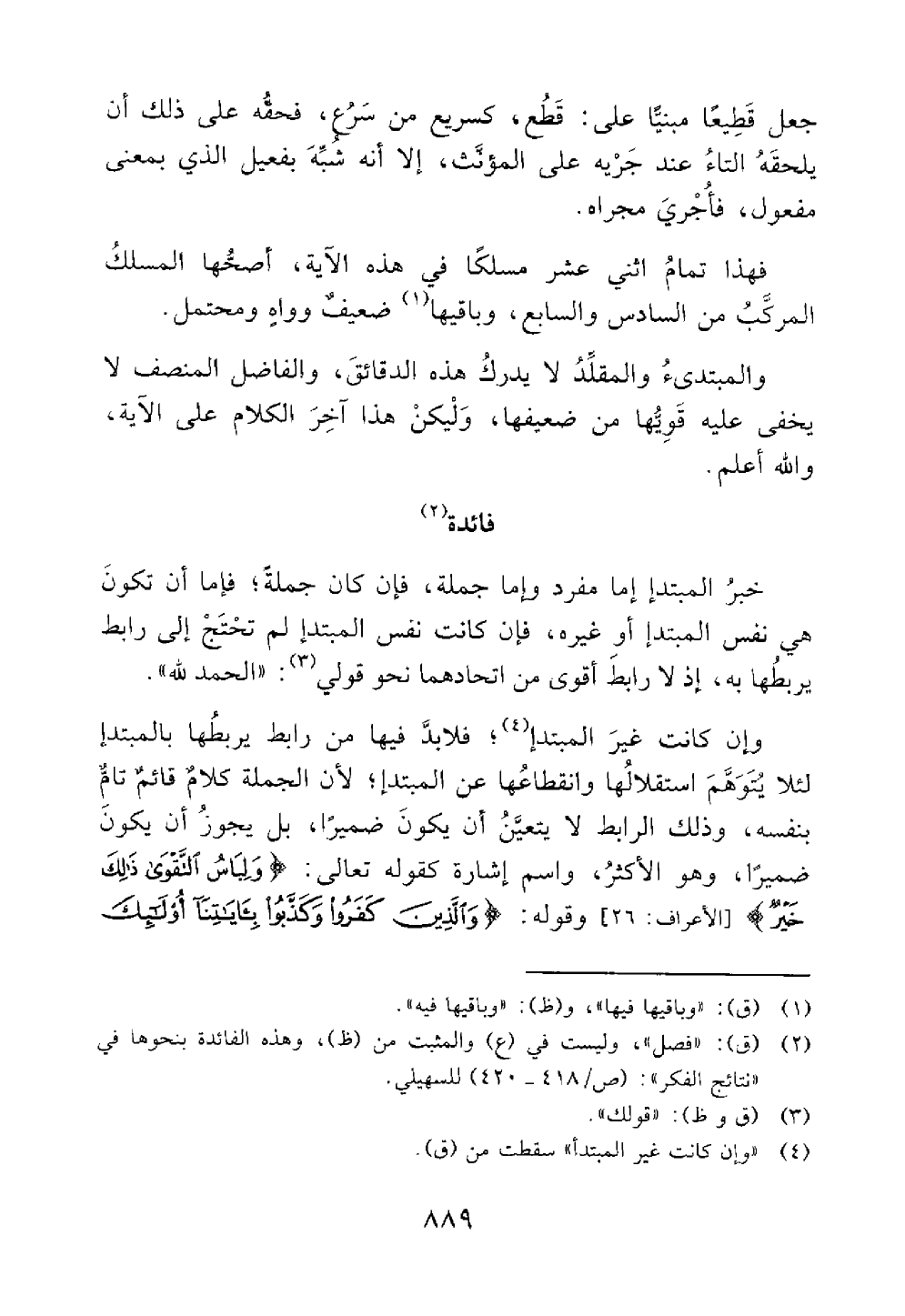 المؤنث إلا أنه شبه بفعيل الذي بمعنى مفعول فأجرى مجراه فهذا تمام اثنى عشر مسلكا في هذه الآية اصحها المسلك المركب من السادس والسابع وباقيها ضعيف وواه ومحتمل