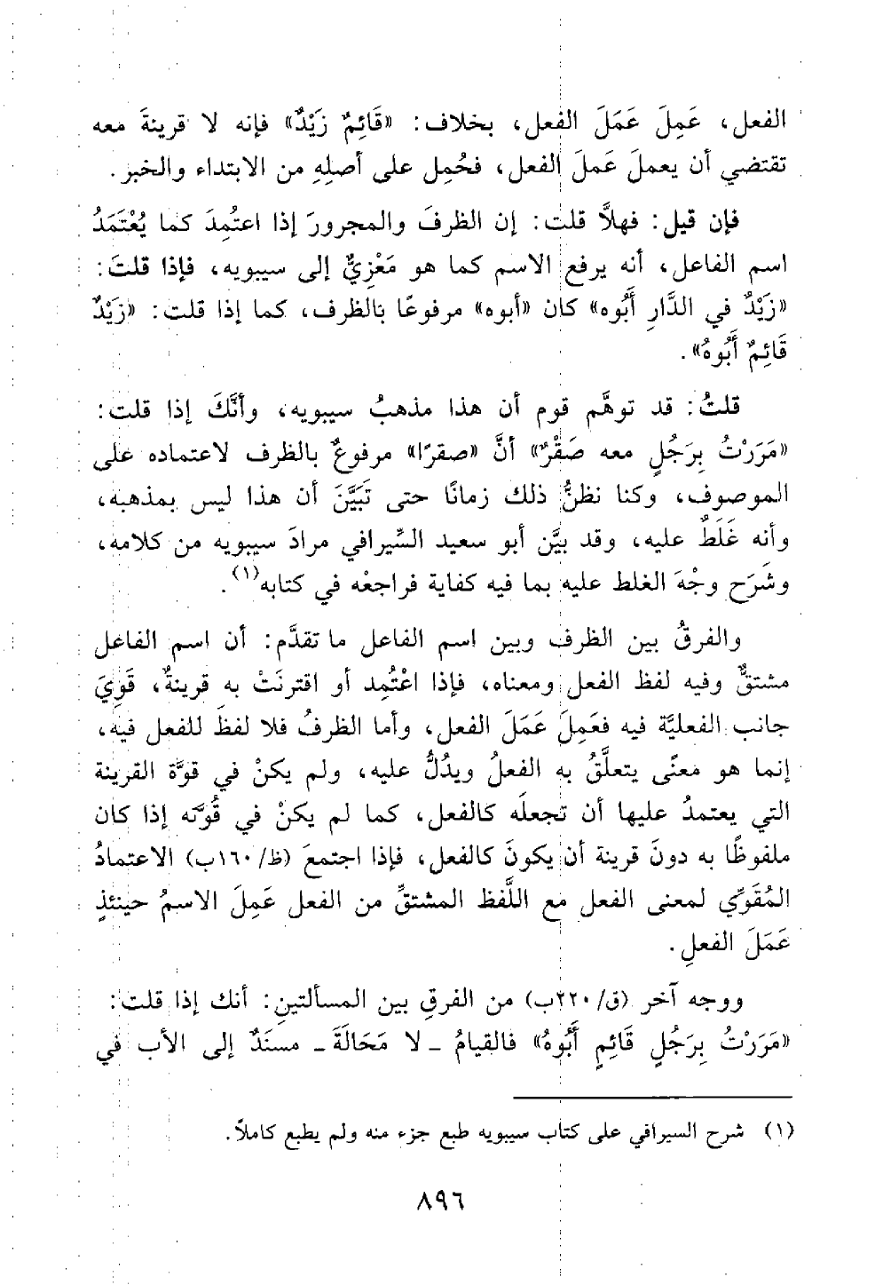 والفرق بين الظرف وبين اسم الفاعل ما تقدم أن اسم الفاعل مشتق وفيه لفظ الفعل ومعناه فإذا اعتمد أن اقترنت به قرينة جانب الفعلية فيه فعمل عمل الفعل وأما الظرف فلا لفظ للفعل فيه إنما هو معنى يتعلق به الفعل ويدل عليه ولم يكن في قوة القرينة التي يعتمد عليها أن تجعله كالفعل كما لم يكن في قوته إذا كان ملفوظا به دون قرينة أن يكون كالفعل فإذا اجتمع الاعتماد المقوي لمعنى الفعل مع اللفظ المشتق من الفعل عمل الاسم حينئذ عمل الفعل