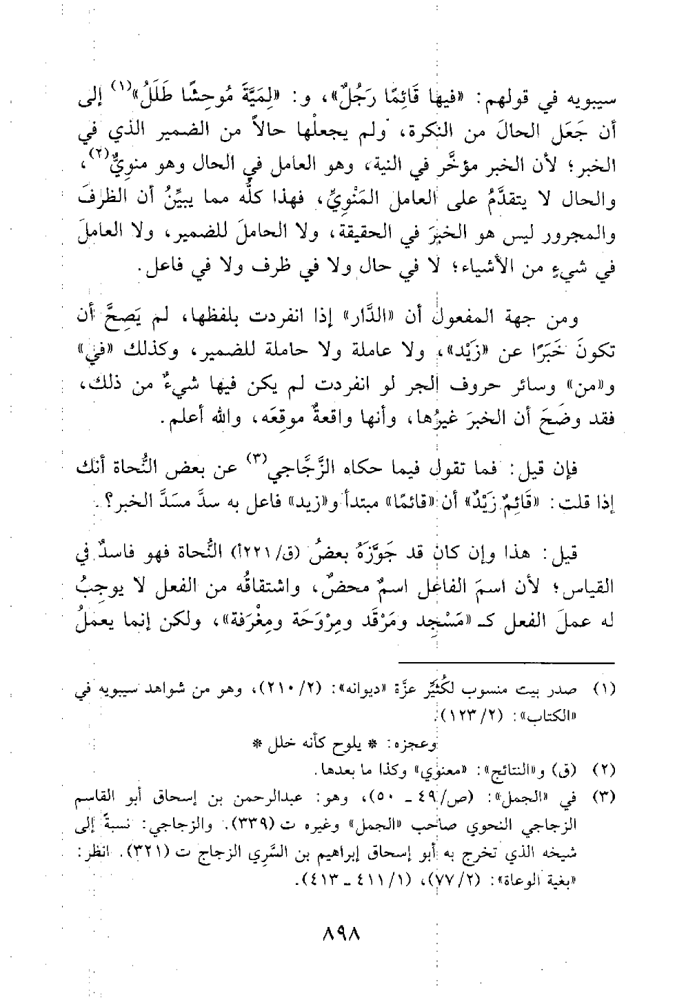 سيبويه في قولهم فيها قائما رجل ولمية موحشا طلل إلى أن جعل الحال من النكرة ولم يجعلها حالا من الضمير الذي في الخبر لأن الخبر مؤخر في النية وهو العامل في الحال وهو منوي والحال لا يتقدم على العامل المنوي فهذا كله مما يبين أن الظرف والمجرور ليس هو الخبر في الحقيقة ولا الحامل للضمير ولا العامل في شيء من الأشياء لا في حال ولا في ظرف ولا في فاعل
