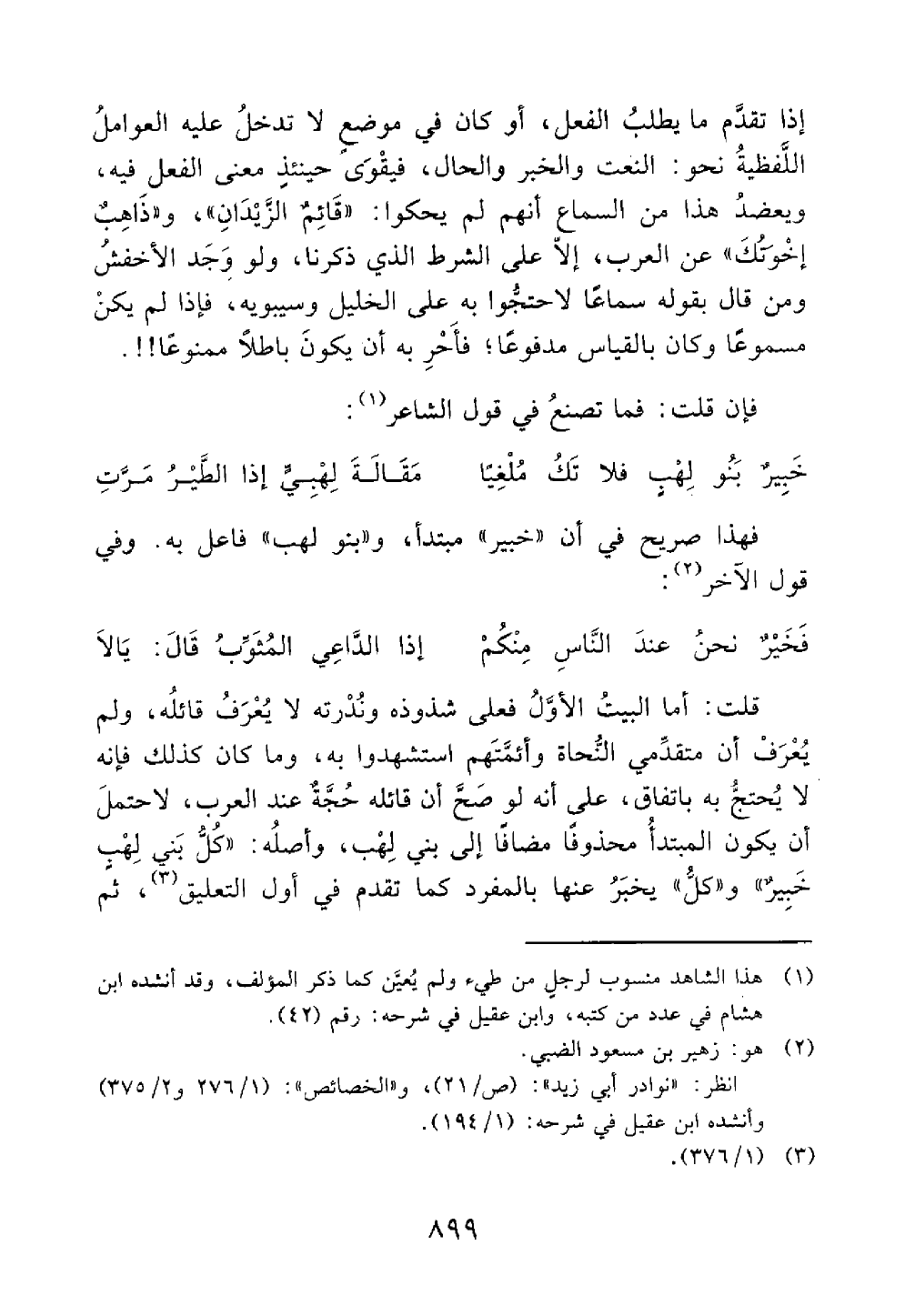 قلت أما البيت الأول فعلى شذوذه وندرته لا يعرف قائله ولم يعرف أن متقدمي النحاة وأئمتهم استشهدوا به وما كان كذلك فإنه لا يحتج به باتفاق على أنه لو صح أن قائله حجة عند العرب لاحتمل أن يكون المبتدأ محذوفا مضافا إلى بني لهب وأصله كل بني لهب خبير وكل يخبر عنها بالمفرد كما تقدم في أول التعليق ثم @