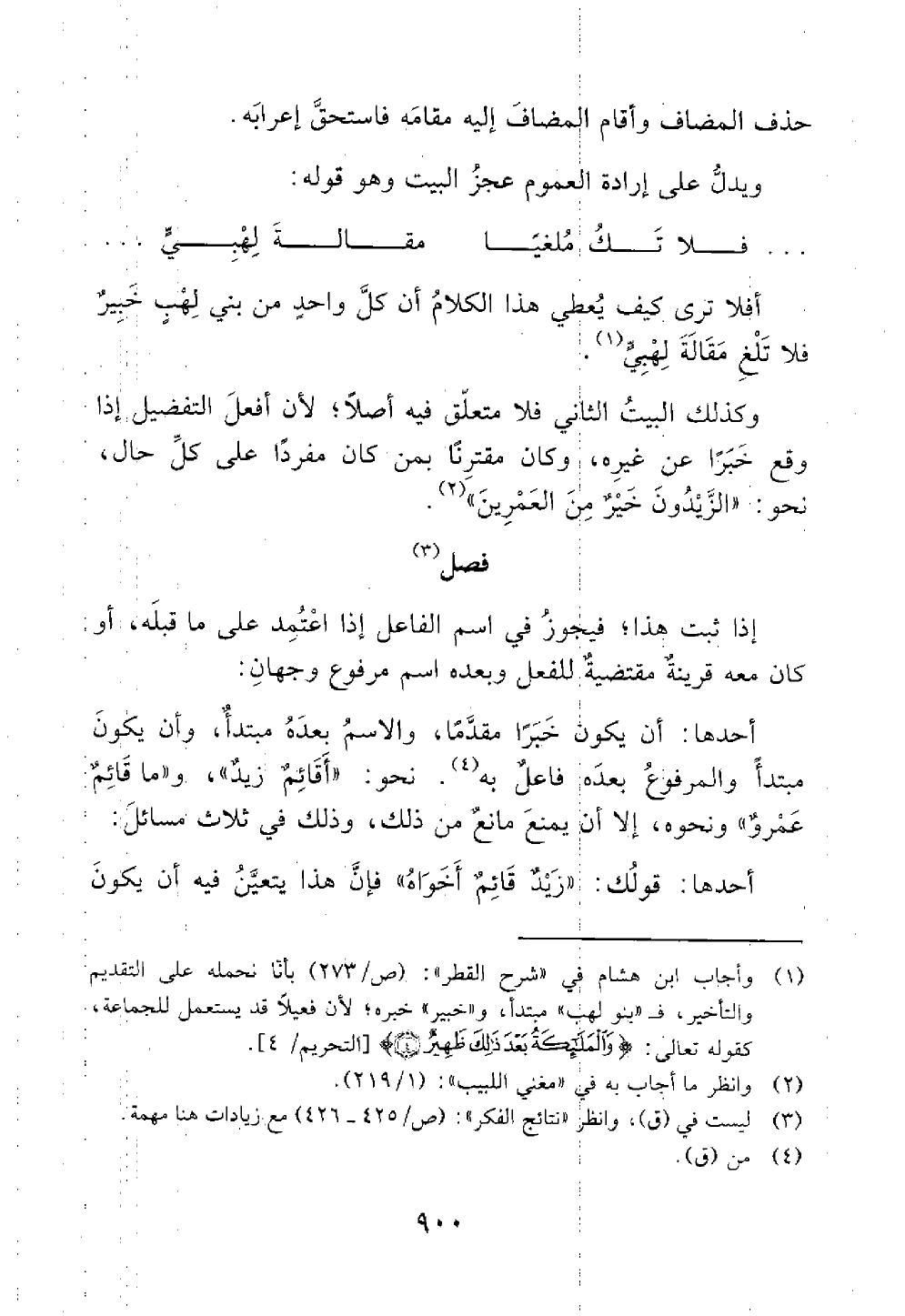 ويدل على إرادة العموم عجز البيت وهو قوله فلا تك ملغيا مقالة لهبي أفلا ترى كيف يعطي هذا الكلام أن كل واحد من بني لهب خبير فلا تلغ مقالة لهبي وكذلك البيت الثاني فلا متعلق فيه أصلا لأن أفعل التفضيل إذا وقع خبرا عن غيره وكان مقترنا بمن كان مفردا على كل حال نحو الزيدون خير من العمرين فصل وجوه اسم الفاعل