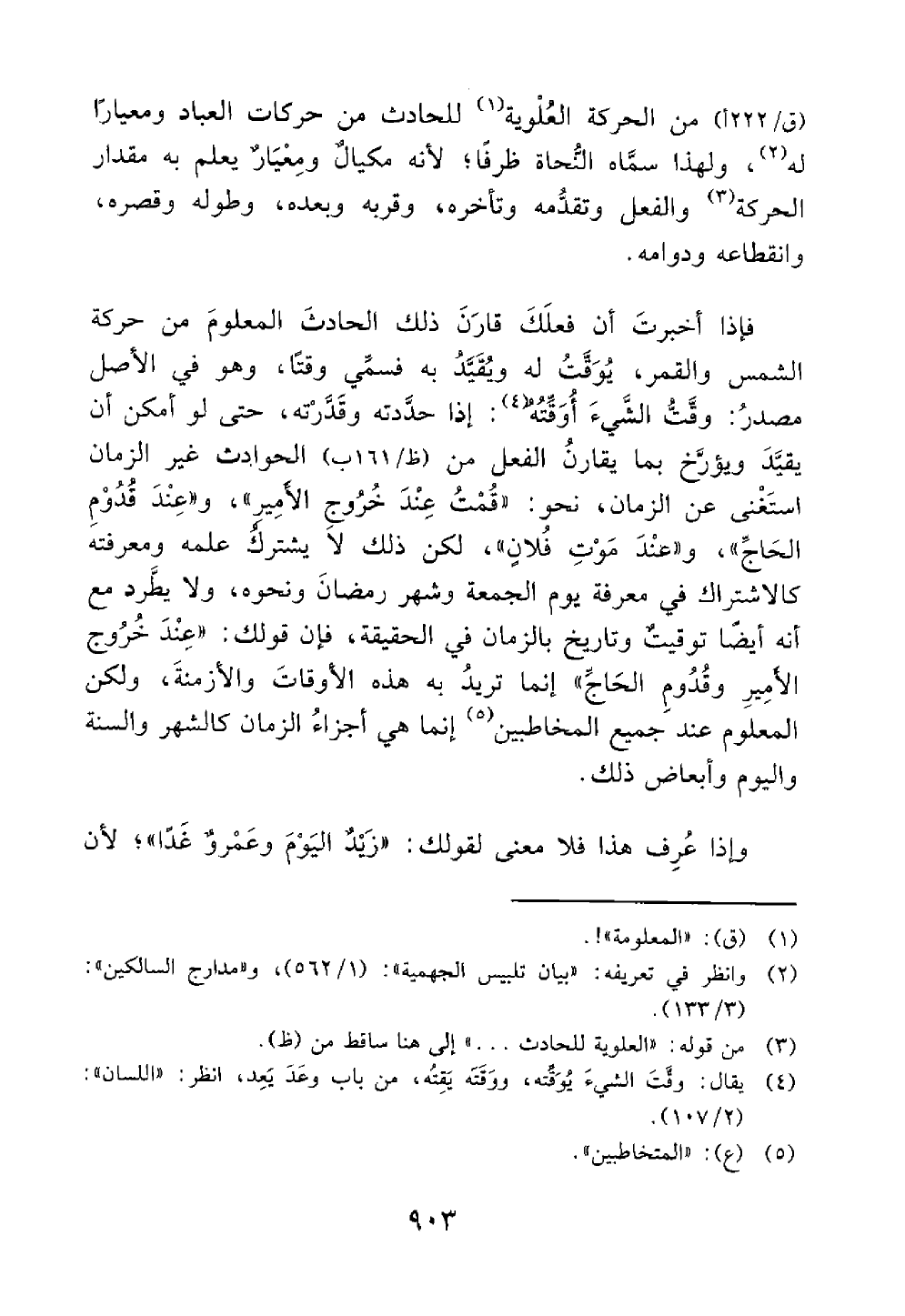 من الحركة العلوية للحادث من حركات العباد ومعيارا له ولهذا سماه النحاة ظرفا لأنه مكيال ومعيار يعلم به مقدار الحركة والفعل وتقدمه وتأخره وقربه وبعده وطوله وقصره وانقطاعه ودوامه