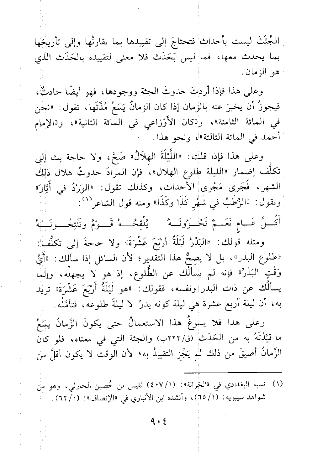 وعلى هذا فإذا أردت حدوث الجثة ووجودها فهو أيضا حادث فيجوز أن يخبر عنه بالزمان إذا كان الزمان يسع مدتها تقول نحن في المائة الثامنة وكان الأوزاعي في المائة الثانية والإمام أحمد في المائة الثالثة ونحو هذا