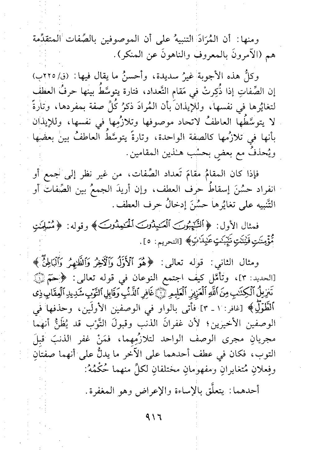 فإذا كان المقام مقام تعداد الصفات من غير نظر إلى جمع أو انفراد حسن إسقاط حرف العطف وإن أريد الجمع بين الصفات أوالتنبيه على تغايرها حسن إدخال حرف العطف فمثال ألأول التائبون العابدون الحامدون وقوله مسلمات مؤمنات قانتات تائبات