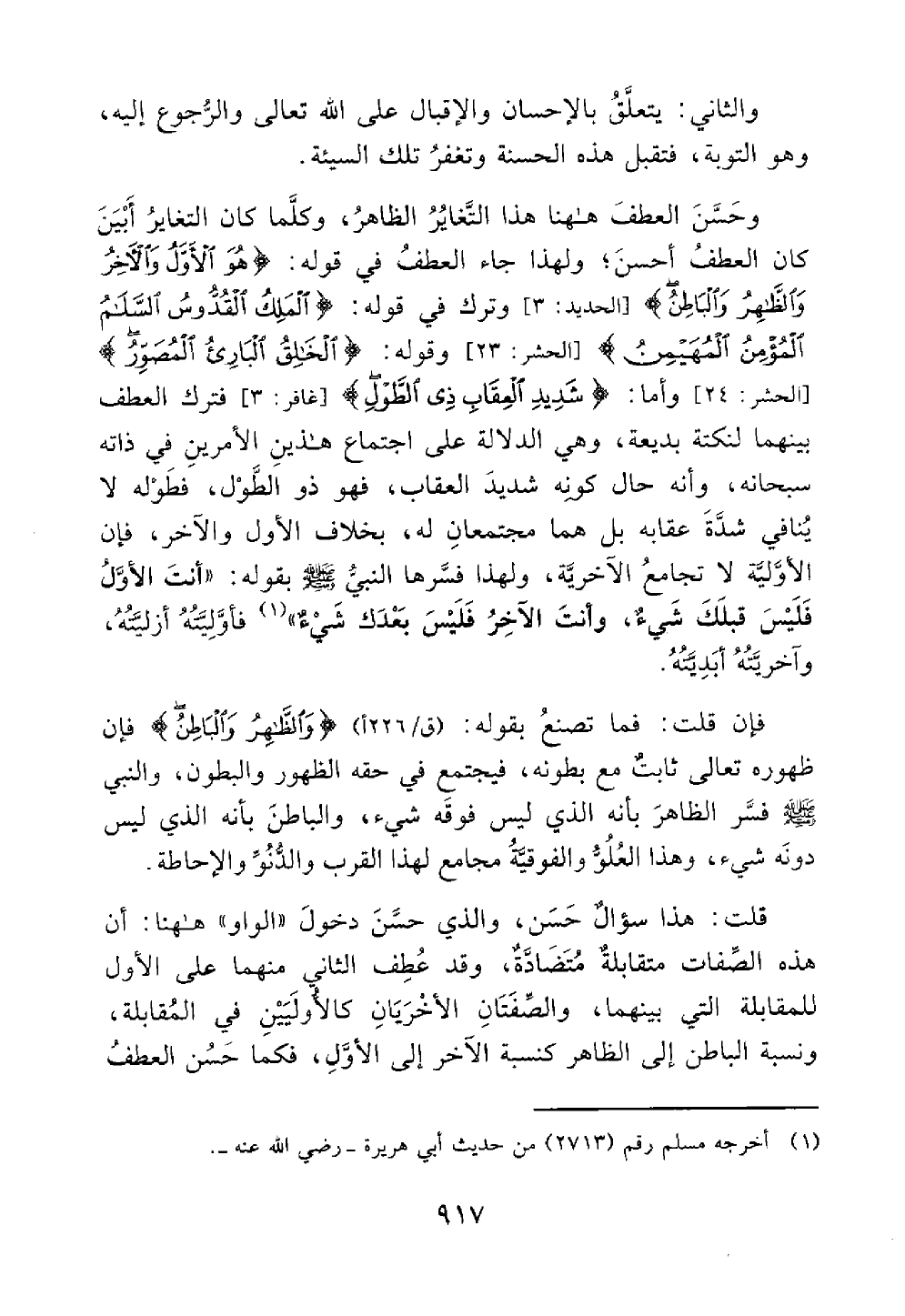 وحسن العطف ههنا هذا التغاير الظاهر وكلما كان التغاير أبين كان العطف أحسن ولهذا جاء العطف في قوله هو الأول والآخر والظاهر والباطن وترك في قوله الملك القدوس السلام المؤمن المهيمن وقوله الخالق الباريء المصور وأما شديد العقاب ذي الطول فترك العطف بينهما لنكته بديعة وهي الدلالة على اجتماع هذين الأمرين في ذاته سبحانه وأنه حال كونه شديد العقاب فهو ذو الطول وطوله لا ينافى شدة عقابه بل هما مجتمعان له بخلاف الأول والآخر فإن الأولية لا تجامع الآخرية ولهذا فسرها النبي بقوله أنت الأول فليس قبلك شيء وأنت الآخر فليس بعدك شيء فأوليته أزليته وآخريته أبديته