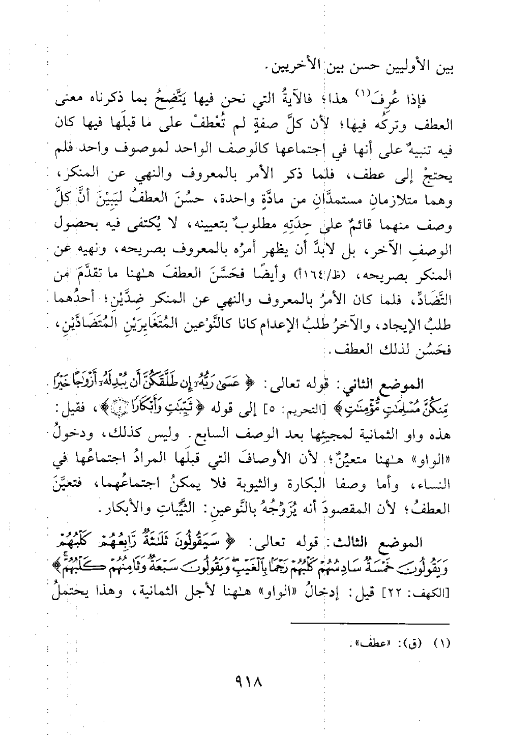 فإذا عرف هذا فالآية التي نحن فيها يتضح بما ذكرناه معنى العطف وتركه فيها لأن كل صفة لم تعطف على ما قبلها فيها كان فيه تنبيه على أنها في اجتماعها كالوصف الواحد لموصوف واحد فلم يحتج إلى عطف فلما ذكر الأمر بالمعروف والنهى عن المنكر وهما متلازمان مستمدان من مادة واحدة حسن العطف ليتبين أن كل وصف منهما قائم على حدته مطلوب تعيينه لا يكتفي فيه بحصول الوصف الآخر بل لا بد أن يظهر أمره بالمعروف بصريحة ونهيه عن المنكر بصريحة وأيصا فحسن العطف ههنا ما تقدم من التضاد فلما كان الأمر بالمعروف والنهي عن المنكر ضدين أحدهما طلب الإيجاد والآخر طلب الإعدام كانا كالنوعين المتغايرين المتضادين فحسن لذلك العطف