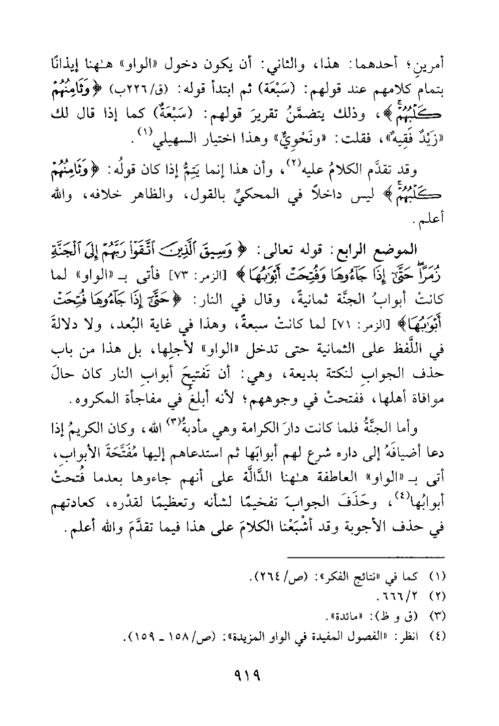 الموضع الرابع قوله تعالى وسيق الذين اتقوا ربهم إلى الجنة زمرا حتى إذا جاءوها وفتحت أبوابها فأتى بالواو لما كانت أبواب الجنة ثمانية وقال في النار حتى أذا جاءونا فتحت أبوابها لما كانت سبعة وهذا في غاية البعد ولا دلالة في اللفظ على الثمانية حتى تدخل الواو لأجلها بل هذامن باب حذف الجواب لنكتة بديعة وهي أن تفتيح أبواب النار كان حال موافاة أهلها ففتحت في وجوههم لأنه أبلغ في مفاجأة المكروه