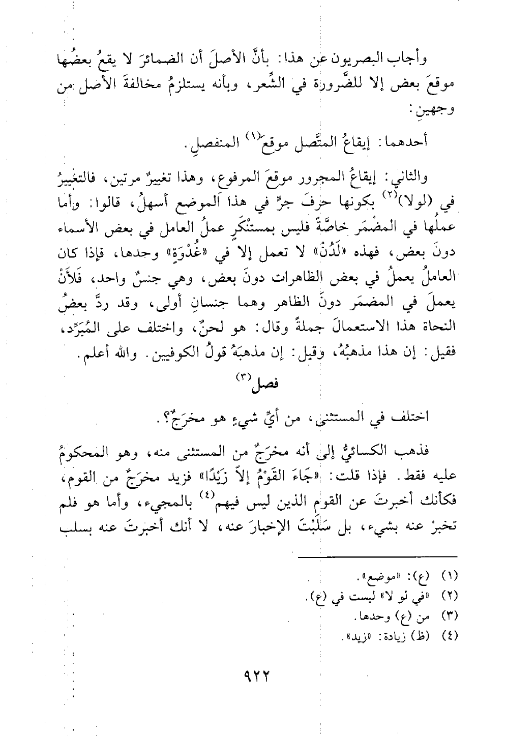 والثاني إيقاع المجرور موقع المرفوع وهذا تغيير مرتين فالتغينير في لولا بكونها حرف جر في هذا الموضع أسهل قالوا وأما عملها في المضمر خاصة فليس بمستنكر عمل العامل في بعض الأسماء دون بعض فهذه لدن لا تعمل إلا في غدوة وحدها فإذا كان العامل يعمل في بعض الظاهرات دون بعض وهي جنس واحد فلأن يعمل في المضمر دون الظاهر وهما جنسان أولى وقد رد بعض النحاة هذا الاستعمال جملة وقال هو لحن واختلف على المبرد فقيل إن هذا مذهبه وقيل إن مذهبه قول الكوفيين والله اعلم فصل مذهب النحاة في المستثنى