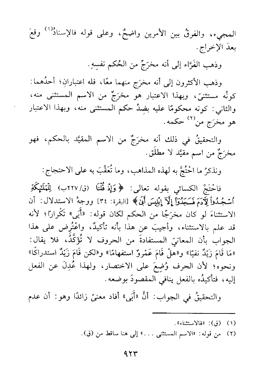 احتج الكسائي بقوله تعالى وإذ قلنا للملائكة اسجدوا لآدم فسجدوا إلا إبليس أبي ووجه الاستدلال أن الاستثناء لو كان مخرجا من الحكم لكان قوله أبي تكرار لأنه قد علم بالاستثناء وأجيب عن هذا بأنه تأكيد واعترض على هذا الجواب بأن المعاني المستفادة من الحروف لا تؤكد فلا يقال ما قام زيد نفيا وهل قام عمرو استفهاما ولكن قام زيد استدراكا ونحوه لأن الحرف وضع على الاختصار ولهذا عدل عن الفعل إليه فتأكيده بالفعل ينافي المقصود بوضعه