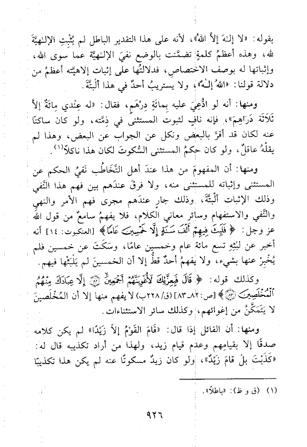 ومنها أن القائل إذا قال قام القوم إلا زيدا لم يكن كلامه صدقا إلا بقيامهم وعدم قيام زيد ولهذا من أراد تكذيبه قال له كذبت بل قام زيد ولو كان زيد مسكوتا عنه لم يكن هذا تكذيبا @