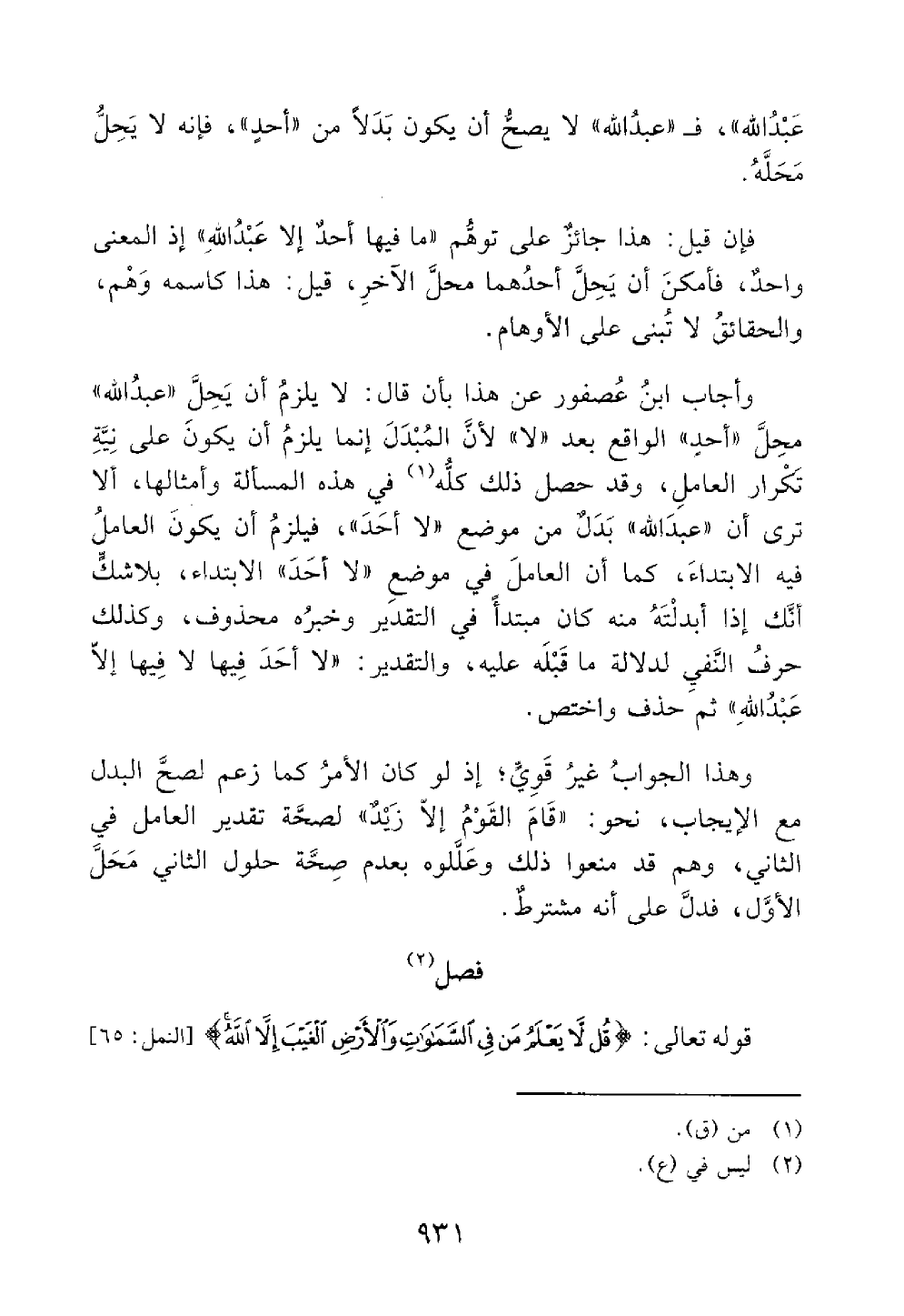 فإن قيل هذا جائز على توهم ما فيها أحد إلا عبد الله إذ المعنى واحد فأمكن أن يحل أحدهما محل الأخر قيل هذا كاسمه وهم والحقائق لا تبني على الأوهام وأجاب ابن عصفور عن هذا بأن قال لا يلزم أن يحل عبد الله محل أحد الواقع بعد لا لأن المبدل إنما يلزم أن يكون على نية تكرار العامل وقد حصل ذلك كله في هذه المسألة وأمثالها ألا ترى أن عبد الله بدل من موضع لا أحد فيلزم أن يكون العامل فيه الابتداء كما أن العامل في موضع لا أحد الابتداء