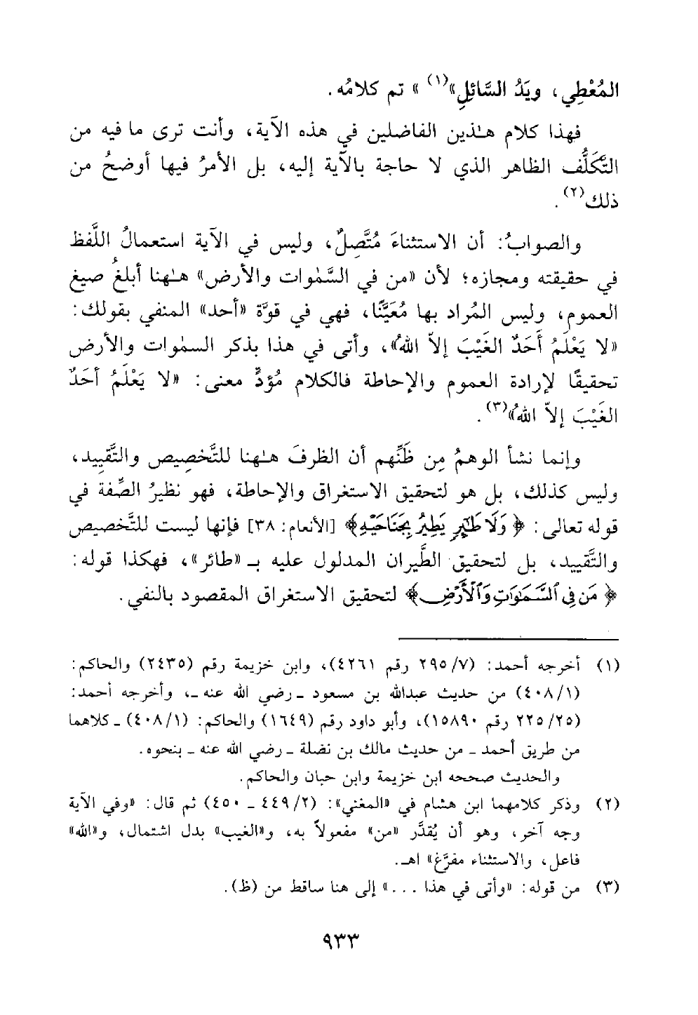 فهذا كلام هذين الفاضلين في هذه الآية وأنت ترى ما فيه من التكلف الظاهر الذي لا حاجة بالآية إليه بل الأمر فيها أوضح من ذلك الصواب في الاستثناء في هذه الآية