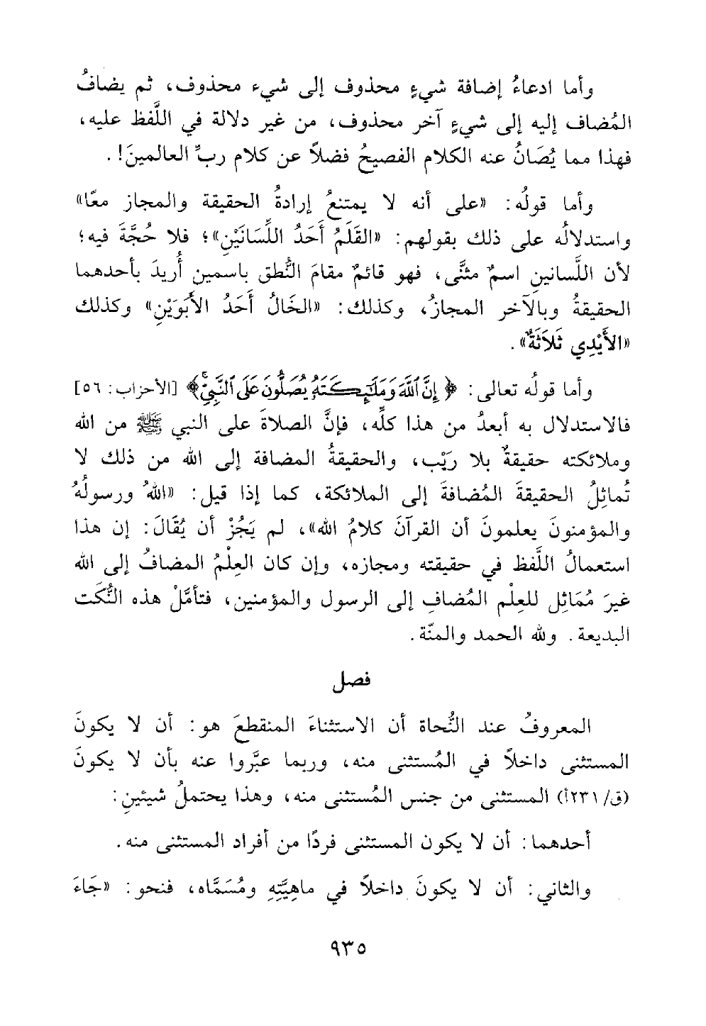 وأما قوله تعالى إن الله وملائكته يصلون على النبي فالاستدلال به أبعد من هذا كله فإن الصلاة على النبي الله وملائكته حقيقة بلا ريب والحقيقة المضافة إلى الله من ذلك لا تماثل الحقيقة المضافة إلى الملائكة كما أذا قيل الله ورسوله والمؤمنون يعلمون أن القرأن كلام الله لم يجز أن يقال إن هذا استعمال اللفظ في حقيقتة ومجازه وإن كان العلم المضاف إلى الله غير مماثل للعلم المضاف إلى الرسول والمؤمنين فتأمل هذه النكت البديعة ولله الحمد والمنة فصل الاستثناء المنقطع
