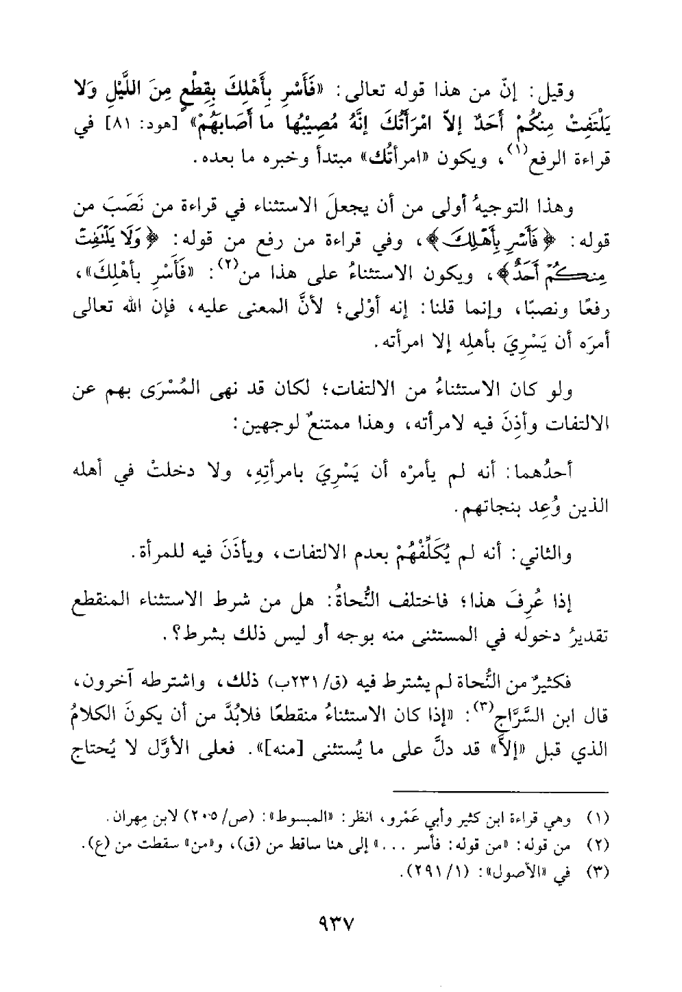 وهذا التوجيه أولى من أن يجعل الاستثناء في قراءة من نصب من قوله فأسر بأهلك وفي قراءة من رفع من قوله ولا يلتفت منكم أحد ويكون الاستثناء على هذا من فأسر بأهلك رفعا ونصبا وإنما قلنا إنه أولى لأن المعنى عليه فإن الله تعالى أمره أن يسري بأهله إلا امرأته