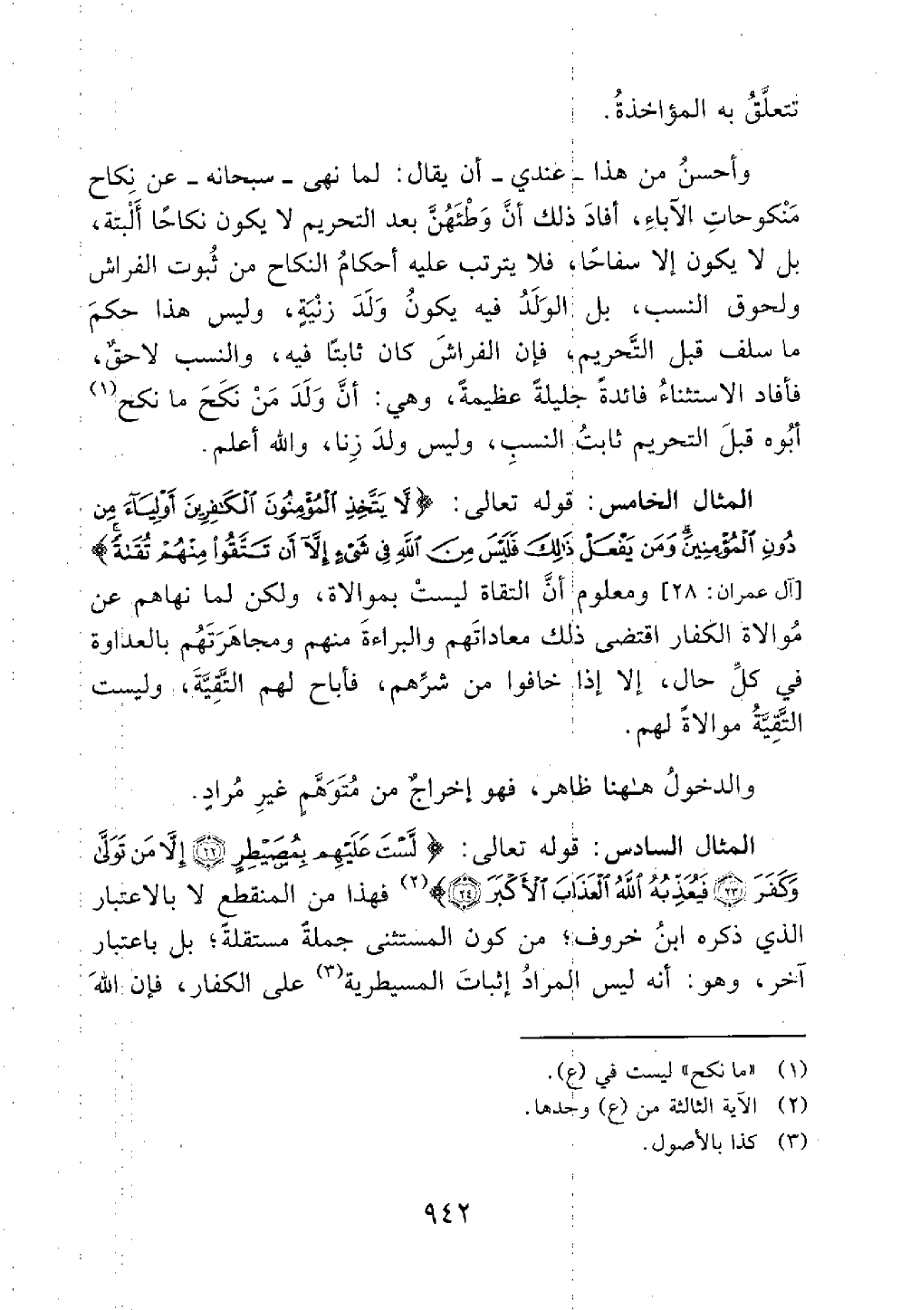 المثال الخامس قوله تعالى لا يتخذ المؤمنون الكافرين أولياء من دون المؤمنين ومن يفعل ذلك فليس من الله في شيء إلا أن تتقوا منهم تقاة ومعلوم أن التقاة ليست بموالاة ولكن لما نهاهم عن موالاة الكفار اقتضي ذلك معاداتهم والبراءة منهم ومجهرتهم بالعدوان في كل حال إلا إذا خافوا من شرهم فأباح لهم التقية وليست التقية موالاة لهم