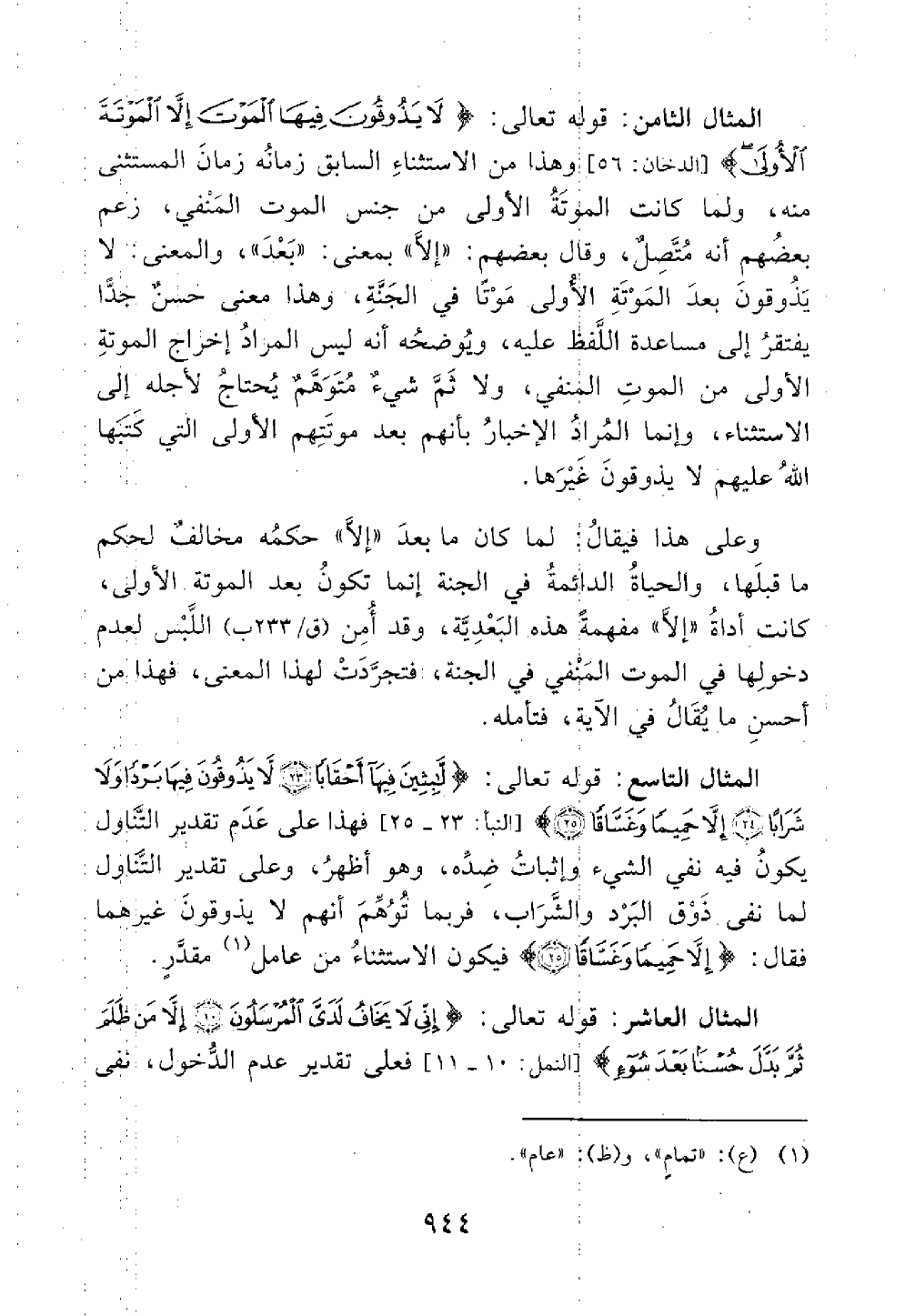 المثال الثامن قوله تعالى لا يذوقون فيها الموت إلا الموتة الأولى فهذا من الاستثناء السابق زمانه زمان المستثنى منه ولما كانت الموته الأولى من جنس الموت المنفى زعم بعضهم أنه متصل وقال بعضهم إلا بمعنى بعد والمعنى لا يذوقون بعد الموتة الأولى موتا في الجنة وهذا معنى حسن جدا يفتقر إلى مساعدة اللفظ عليه ويوضحه أنه ليس المراد إخراج الموته الأولى من الموت المنفي ولا ثم شيء متوهم يحتاج لأجله إلى الاستثناء وإنما المراد الإخبار بأنهم بعد موتتهم الأولى التي كتبها الله عليهم لا يذوقون غيرها