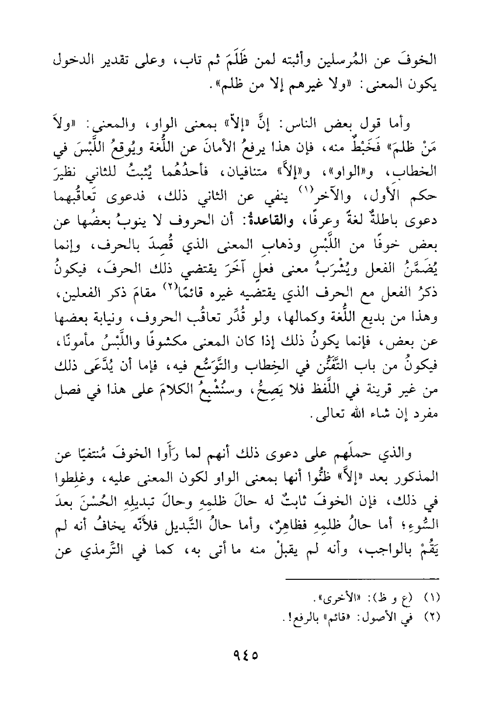 وإما قول بعض الناس أن إلا بمعنى الواو والمعنى ولا من ظلم فخبط منه فإن هذا يرفع الأمان عن اللغة ويوقع اللبس في الخطاب والواو وإلا متنافيتان فإحداهما تثبت للثاني نظير حكم الأول والأخرى تنفى عن الثاني ذلك فدعوى تعاقبتهما دعوى باطلة لغة وعرفا والقاعدة أن الحروف لا ينوب بعضها عن بعض خوفا من اللبس وذهاب المعنى الذي قصد بالحرف وإنما يضمن ويشرب معنى فعل آخر يقتضي ذلك الحرف فيكون ذكر الفعل مع الحرف الذي يقتضيه غيره قائما مقام الذكر الفعلين وهذا من بديع اللغة وكمالها ولو قدر تعاقب الحروف ونيابة بعضها عن بعض فإنما يكون ذلك إذا كان المعنى مكشوفا واللبس مأمونا فيكون من باب التفنن في الخطاب والتوسع فيه فإما أن يدعى ذلك من غير قرينة في اللفظ فلا يصح وسنشبع الكلام على هذا في فصل مفرد إن شاء الله تعالى
