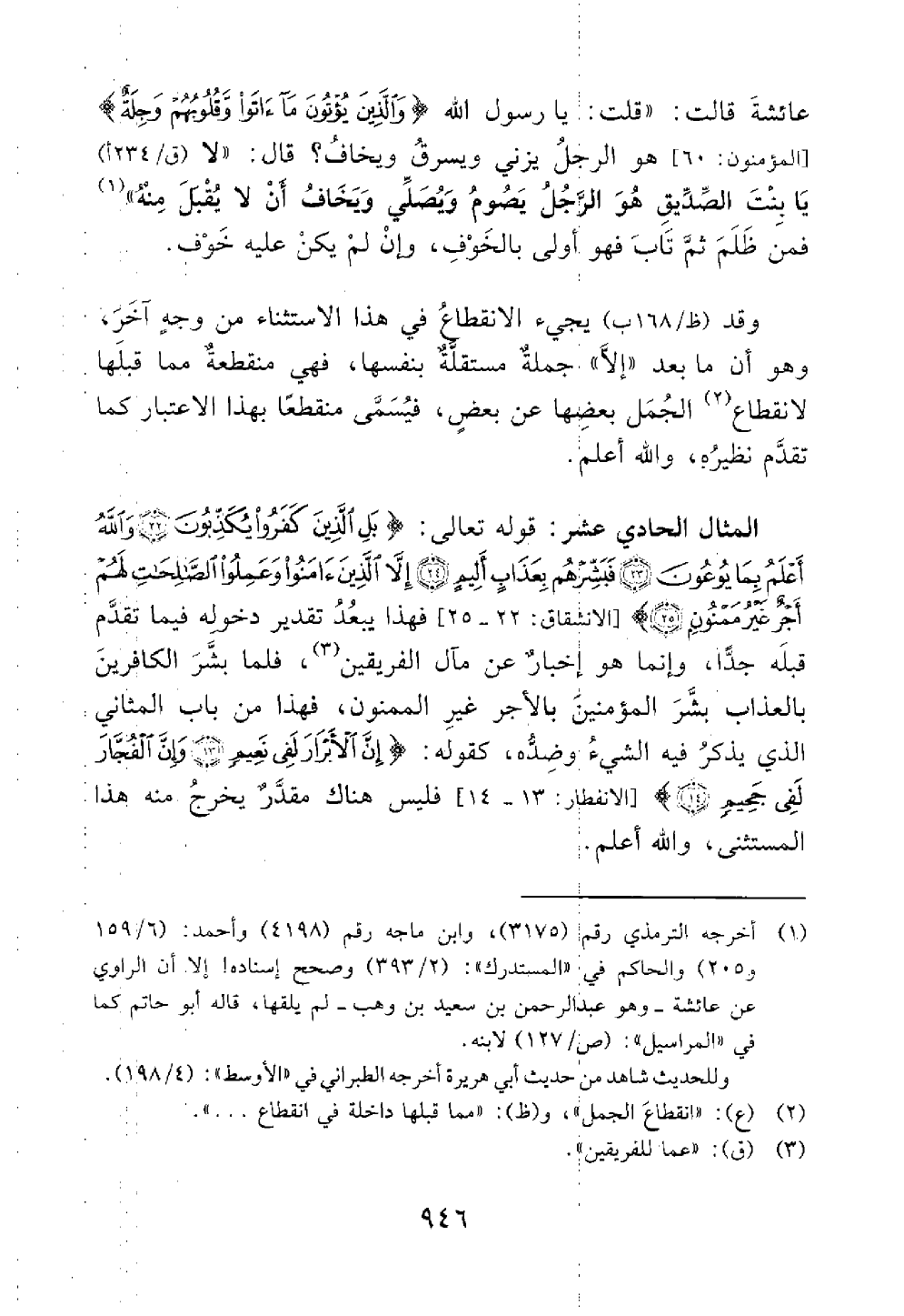عائشة رضي الله عنها قالت قلت يا رسول الله والذين يؤتون ما اتوا وقلوبهم وجلة هو الرجل يزني ويسرق ويخاف قال يا بنت الصديق هو الرجل يصوم ويصلي ويخاف أن لا يقبل منه فمن ظلم ثم تاب فهو أولى بالخوف وإن لم يكن خوف عليه // حسن لغيره // وقد يجيء الانقطاع في هذا الاستثناء