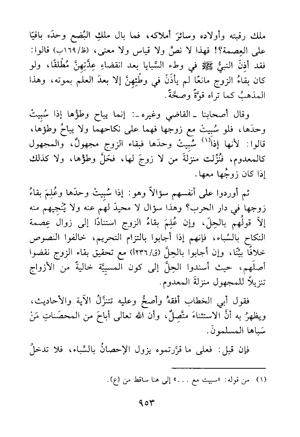 ولا كذلك إذا كان زوجها معها ثم أوردوا على أنفسهم سؤالا وهو إذا سبيت وحدها وعلم بقاء زوجها في دار الحرب وهذا سؤال لا محيد لهم عنه ولا ينجيهم منه إلا قولهم بالحل وإن علم بقاء الزوج استنادا إلى زوال عصمة النكاح بالسبي فإنهم إذا أجابوا بالتزام التحريم خالفوا النصوص خلافا بينا وإن أجابوا بالحل مع تحقيق بقاء الزوج نقضوا أصلهم حيث أسندوا الحل إلى كون المسبية خالية من الزوج تنزيلا للمجهول منزلة المعدوم