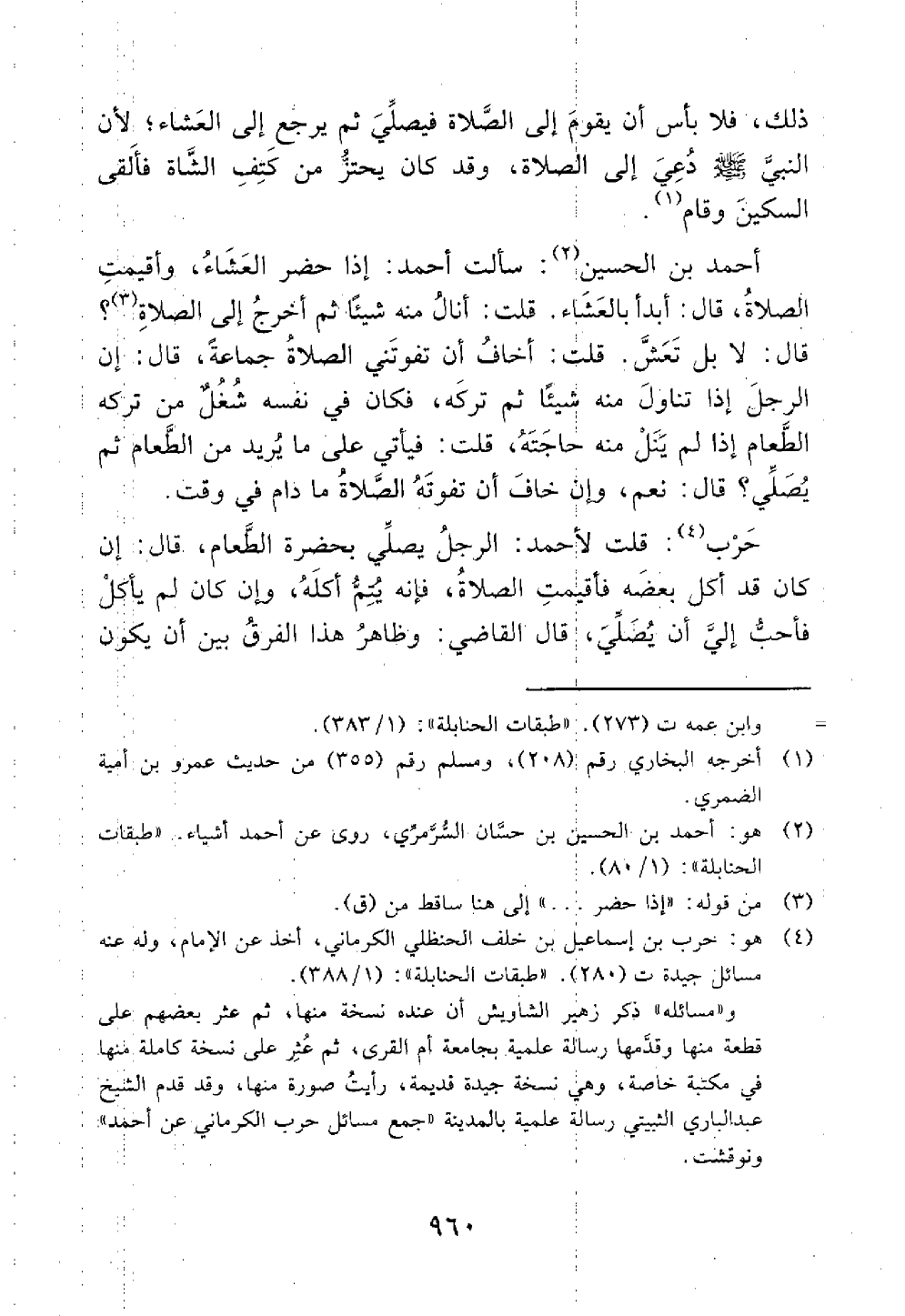 أحمد بن الحسين سألت أحمد إذا حضر العشاء وأقيمت الصلاة قال أبدا بالعشاء قلت أنال منه شيئا ثم أخرج إلى الصلاة قال لابل تعش قلت أخاف أن تفوتني الصلاة جماعة قال أن الرجل إذا تناول منه شيئا ثم تركه فكان في نفسه شغل من ترك الطعام إذا لم ينل منه حاجته قلت فيأتي على ما يريد من الطعام ثم يصلي قال نعم وأن خاف أن تفوته الصلاة ما دام في وقت حرب قلت لأحمد الرجل يصلي بحضرة الطعام قال إن كان قد أكل بعضه فأقيمت الصلاة فإنه يتم أكله وإن كان لم يأكل فأحب إلى أن يصلي قال القاضي وظاهر هذا الفرق بين أن يكون@