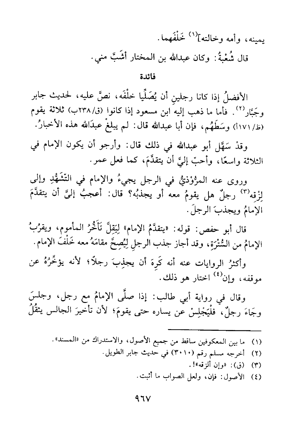 الأفضل إذا كانا رجلين أن يصليا خلفه نص عليه لحديث جابر وجبار فأما ما ذهب إليه ابن مسعود إذا كانوا ثلاثة يقوم وسطهم فإن أبا عبد الله قال لم يبلغ عبد الله هذه الأخبار