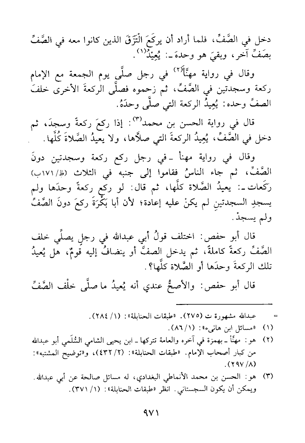 قال أبو حفص اختلف قول ابي عبد الله في رجل يصلي خلف الصف ركعة كاملة ثم يدخل الصف أو ينضاف إليه قوم هل يعيد تلك الركعة وحدها أو الصلاة كلها