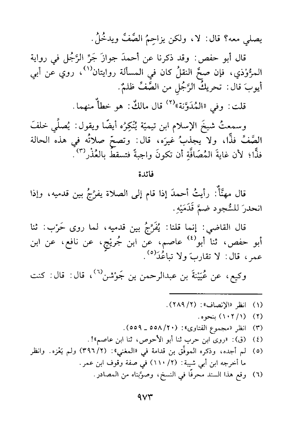 قال القاضي إنما قلنا يفرج بين قدميه لما روى حرب ثنا أبو حفص ثنا أبو عاصم