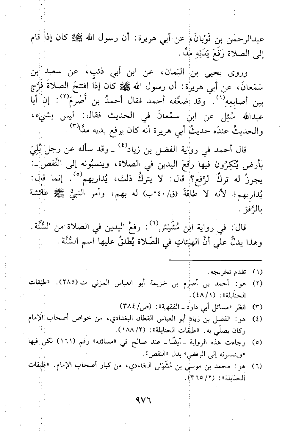 قال أحمد في رواية الفضل بن زيد وقد سأله عن رجل بلي بأرض ينكرون فيها رفع اليدين في الصلاة وينسبونه إلى النقص يجوز له ترك الرفع قال لا يترك ذلك يداريهم إنما قال يداريهم لأنه لا طاقة له بهم وأمر النبي بالرفق قال في رواية ابن مشيش رفع اليدين في الصلاة من السنة وهذا يدل على أن الهيئات في الصلاة يطلق عليها اسم السنة@