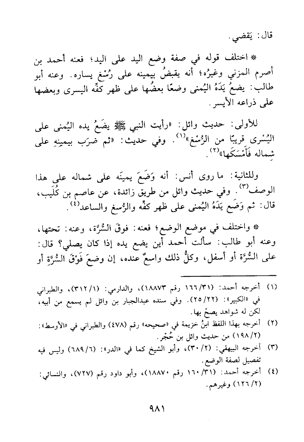 اختلف قوله في صفة وضع اليد على اليد فعنه أحمد بن أصرم المزني وغيره انه يقبض بيمينه على رسغ يساره وعنه أبو طالب يضع يده اليمنى وضعا بعضها على ظهر كفة اليسرى وبعضها على ذراعه الأيسر