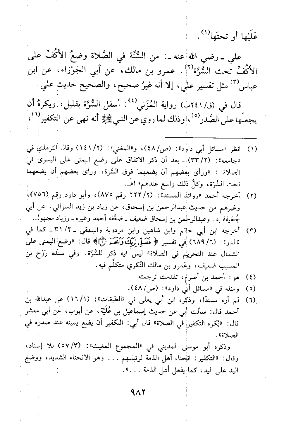 علي رضي الله عنه من السنة في الصلاة وضع الأكف على الأكف تحت السرة // ضعيف //